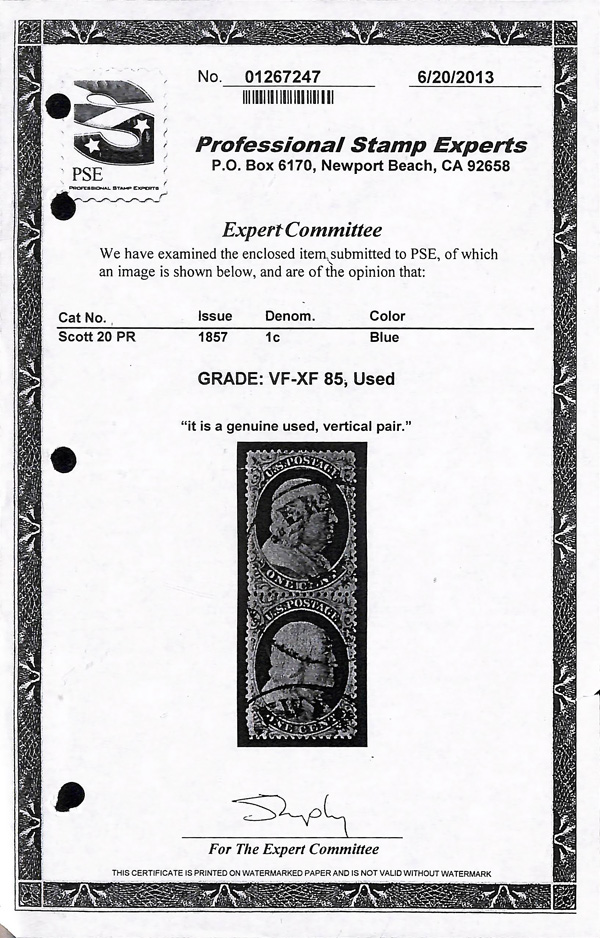 2365 O 20 image1857, 1¢ blue, type II (Scott 20), plate 2, clean and bright with rich color and clear impression; town postmarks unobtrusive, Very Fine to Extremely Fine, with photocopy of 2013 P.S.E. certificate graded VF-XF 85 for pair, this position 2.