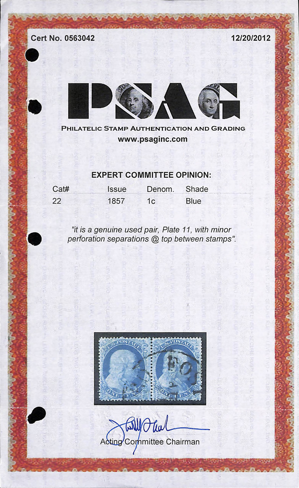 2368 O 22 image1857, 1¢ blue, type IIIa (Scott 22 var.), plate 11, eye-catching with solid centering and intense color, Very Fine, with 2012 P.S.A.G. certificate for pair, this position 2.