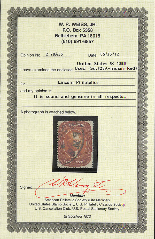 2377 O 28A image1858, 5¢ Indian red, type I (Scott 28A), position 23R1, Post Office fresh and sound with rich color on like-new paper, Fine, with 2012 Weiss certificate.