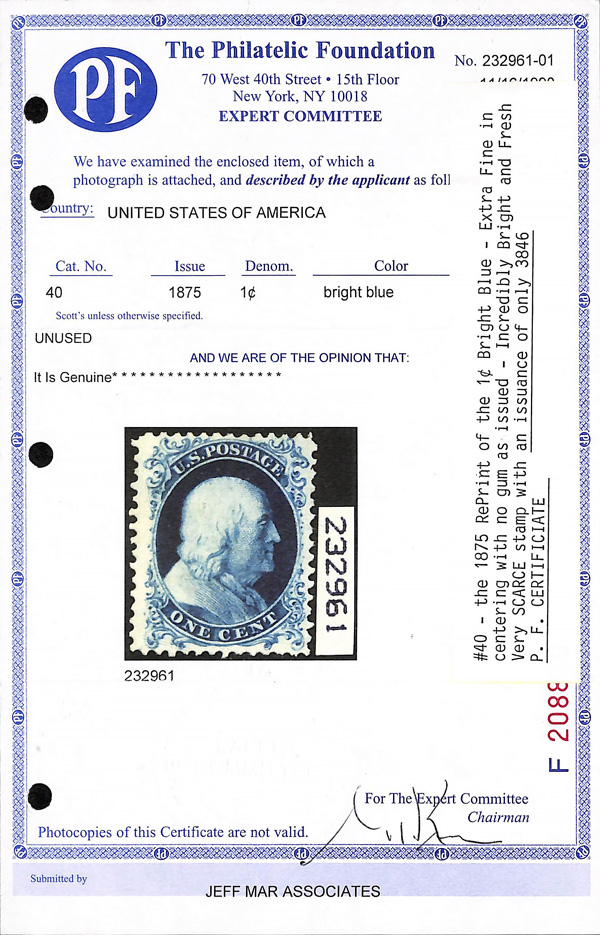 2390 ng 40 image1857-60 (1875 Reprint), 1¢ bright blue (Scott 40), without gum as issued, a lovely example, incredibly bright and fresh, Very Fine, only 3846 sold, with 1990 P.F. certificate.
