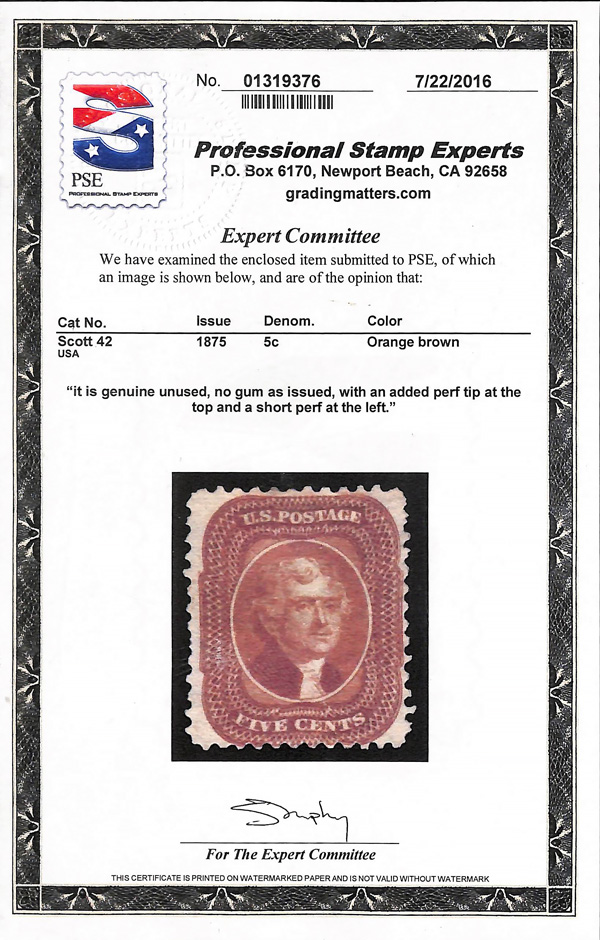 2393 ng 42 image1857-60 (1875 Reprint), 5¢ orange brown (Scott 42), without gum as issued, in attention-grabbing color on bright paper; added perforation tip at top, short perforation at left, Very Fine appearance, only 878 sold, with 2016 P.S.E. certificate.