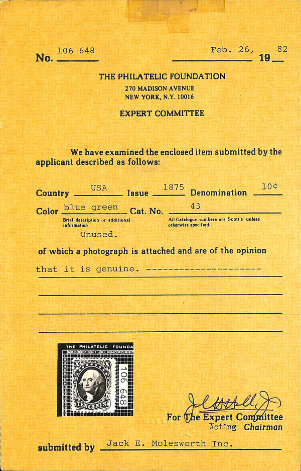 2394 ng 43 image1857-60 (1875 Reprint), 10¢ blue green (Scott 43), without gum as issued, clean and bright with strong impression and clear detail, Fine to Very Fine, only 516 sold, with 1982 P.F. certificate.