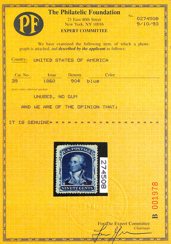 2388 ng 39 image1860, 90¢ blue (Scott 39), unused without gum, Post Office fresh with bold color on like-new paper; slightly rounded upper left corner not mentioned on accompanying certificate, still Very Fine, with 1993 P.F. certificate.