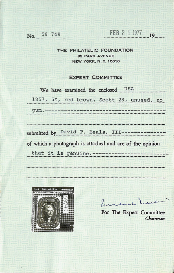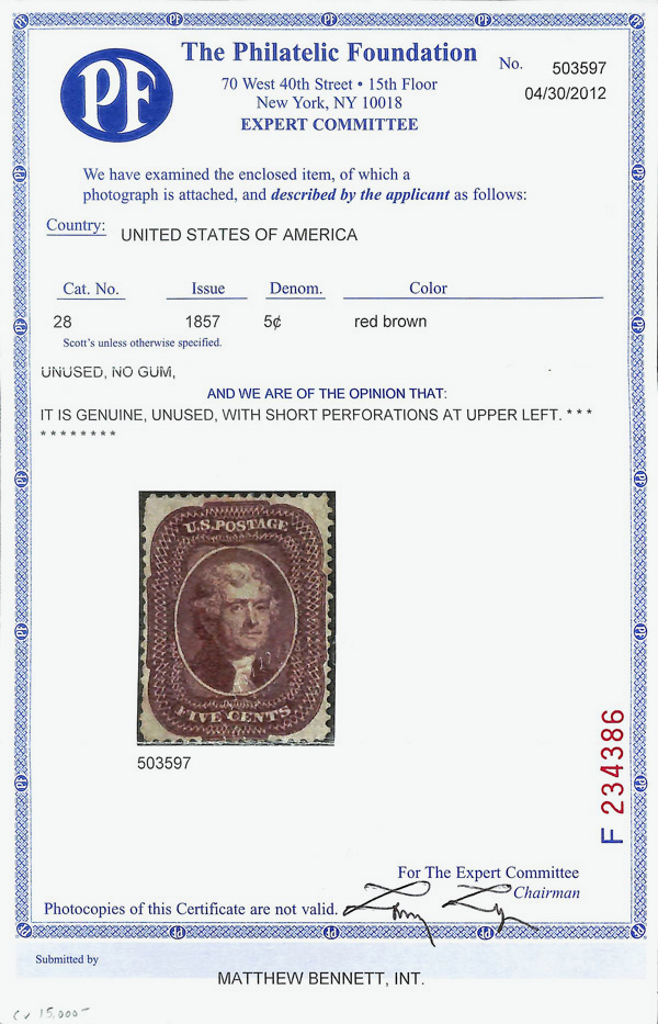 2376 ng 28 image1857, 5¢ red brown, type I (Scott 28), rich color and sharp proof-like impression on bright paper, exceptionally well-centered, only a couple short perfs at top left, unused without gum, still Extremely Fine and extremely scarce, especially in this superior quality. The perforated 5¢ Red Brown (Scott 28) stamps were the first 5¢ perforated stamps to be printed and sent to the post offices. Thus, an estimated 10-15 with original gum, and maybe 20-30 unused without gum, are believed to exist. Most have flaws or are off-center, with 2012 P.F. certificate.