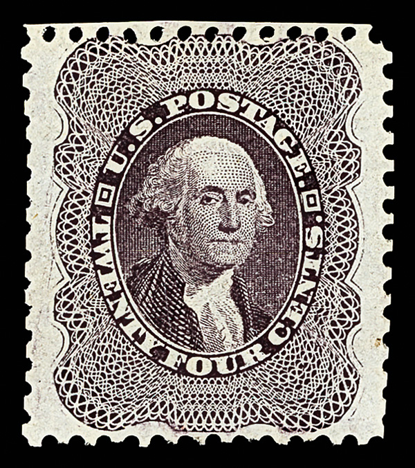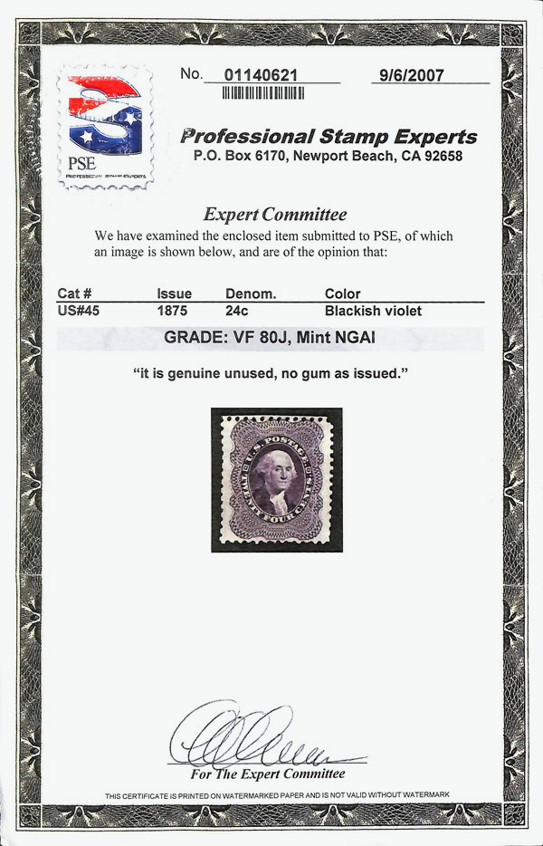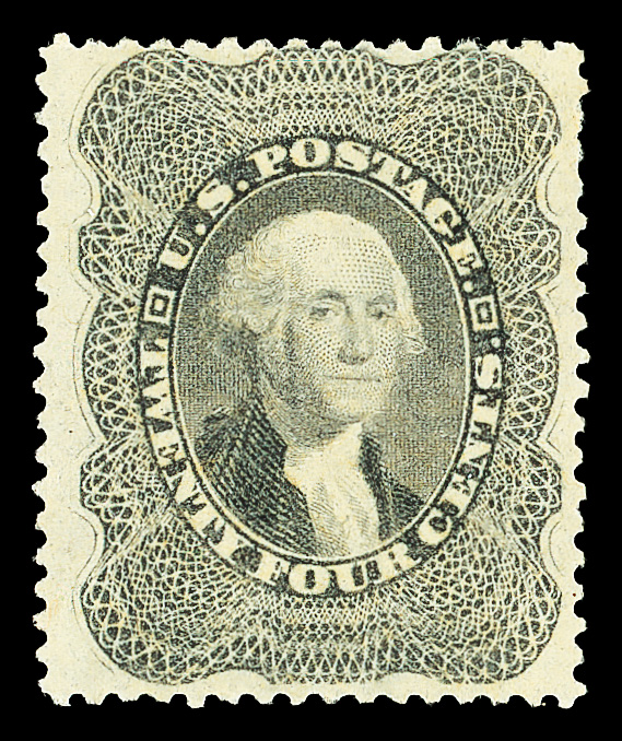 2395 ng 45 image1857-60 (1875 Reprint), 24¢ blackish violet (Scott 45), without gum as issued, immaculate jumbo with proof-like presentation, very well centered, Very Fine, only 479 sold; the only stamp at this grade, with just seven higher, in PSE's Population Report, with 2007 P.S.E. certificate graded VF 80 J.