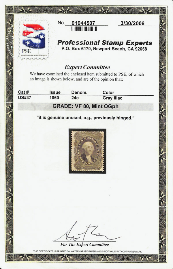 2384 og 37 image1860, 24¢ gray lilac (Scott 37), o.g., lightly hinged, pristine with rich color and clean impression, sound with fresh gum and attractive centering, Very Fine, with 2006 P.S.E. certificate graded VF 80.