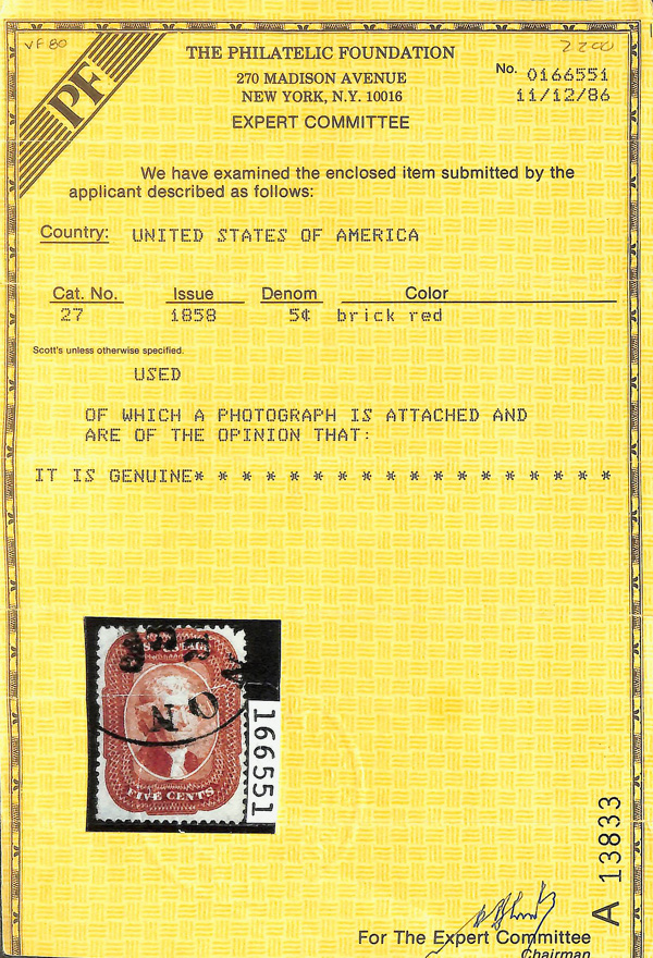 2375 O 27 image1858, 5¢ brick red, type I (Scott 27), attention-grabbing with rich, radiant color and clean printing on sound, like-new paper, Very Fine to Extremely Fine, with 1986 P.F. certificate.