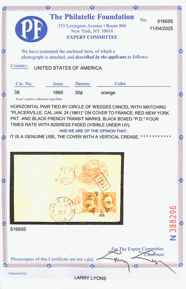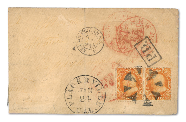 2387 cover 38 image1860, 30¢ orange (Scott 38), horizontal pair tied by circle of wedges cancel with matching 'PLACERVILLE, CAL JAN.24 (1861)' on cover to France: red New York Packet and black French transit marks, black boxed 'P.D.' four times rate with faded address. Vertical crease., Fine to Very Fine, with 2025 P.F. certificate.