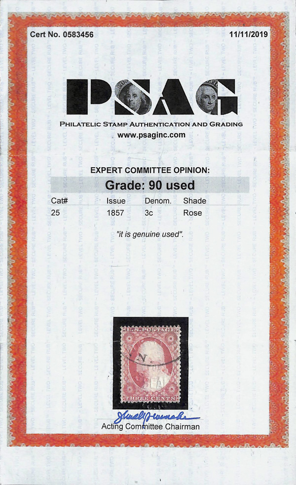 2373 O 25 image1857, 3¢ rose, type I (Scott 25), fresh and sound with rich color and crisp detail; partial town postmark cleanly struck, Extremely Fine, only five stamps grade higher in PSE's Population Report, with 2019 P.S.A.G. certificate graded XF 90.