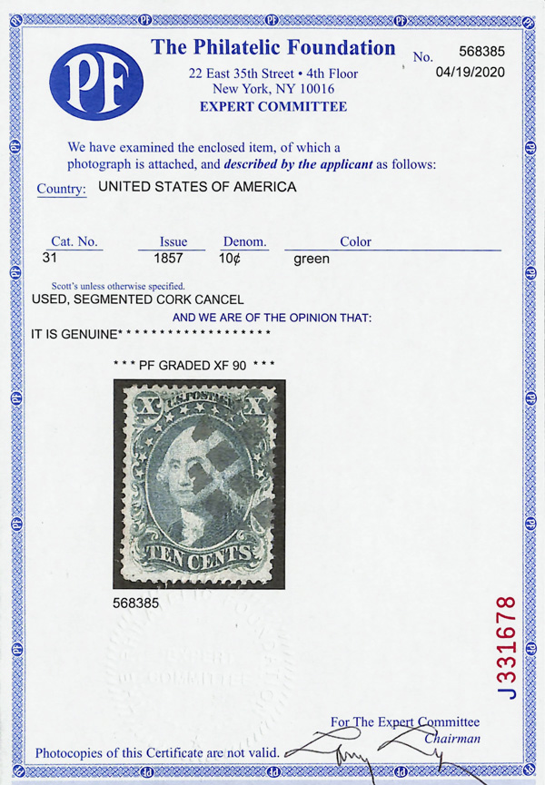 2381 O 31 image1857, 10¢ green, type I (Scott 31), Post Office fresh with deep, rich color and superior centering, segmented cork cancel boldly struck, Extremely Fine, only eight stamps grade higher in PSE's Population Report, with 2020 P.F. certificate graded XF 90.