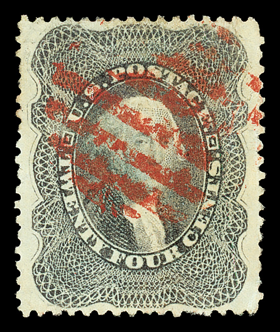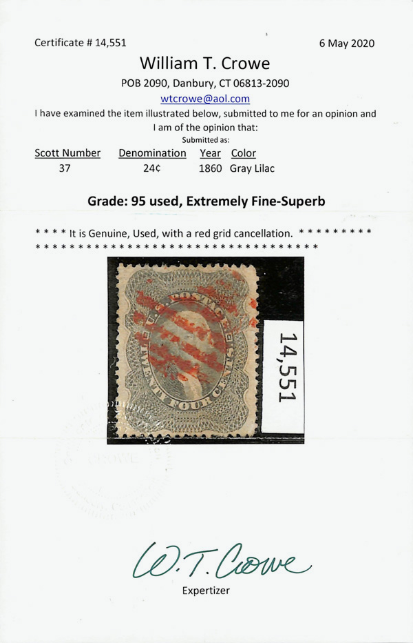 2385 O 37 image1860, 24¢ gray lilac (Scott 37), fresh and sound with wonderful color and centering, the red grid cancel a pretty complement, Extremely Fine to Superb, only six 98s grade higher in PSE's Population Report, with 2020 Crowe certificate graded XF-SUP 95.