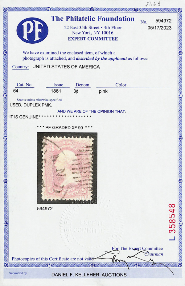 2400 O 64 image1861, 3¢ pink (Scott 64), clearly printed in rich, clean color, sound with centering prettier than its grade, neatly duplex-cancelled, Extremely Fine, only six stamps grade thus, with just two 95s higher, in PSE's Population Report, with 1996 AND 2023 P.F. certificates, the latter graded XF 90.
