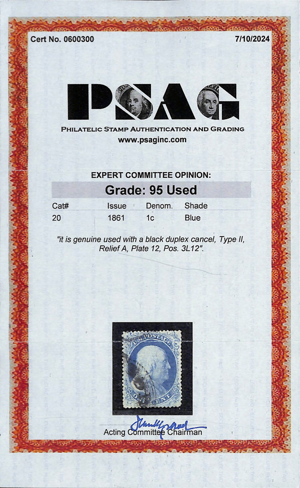 2366 O 20 var. image1857, 1¢ blue, type II (Scott 20 var.), Relief A, Plate 12, position 3L12, sound with luxuriant color and sensational centering; town postmark face-free, Extremely Fine to Superb, a Top of the Pop, PSE's Population Report recording only three stamps at this apex grade, with 2024 P.S.A.G. certificate graded XF-SUP 95.