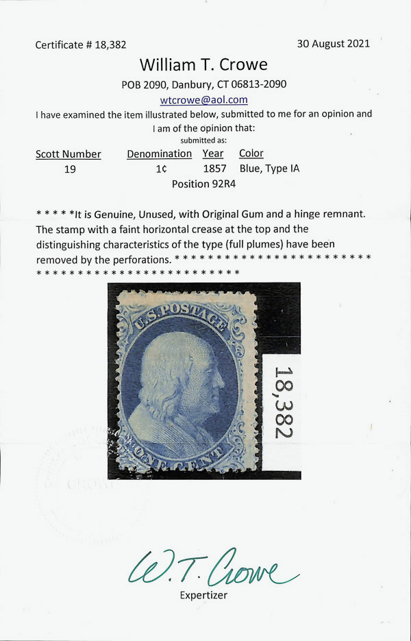 2361 og 19 image1857, 1¢ blue, type Ia (Scott 19), Sparkling fresh color, unfortunately the distinguishing characteristics of the type (full plumes) have been removed by the bottom perforations, o.g., hinge remnant; faint horizontal crease at top, Very Good to Fine, with 2021 Crowe certificate.