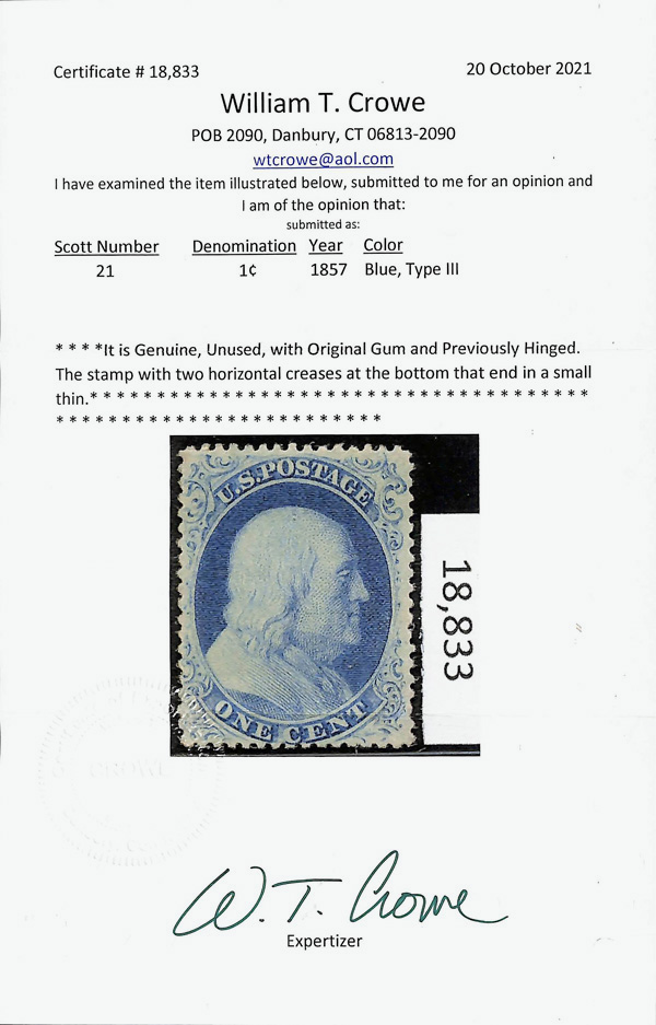 2367 og 21 image1857, 1¢ blue, type III (Scott 21), Beautifully fresh color, o.g., previously hinged; two horizontal creases at the bottom that end with a small thin, Very Fine, with 2021 Crowe certificate.