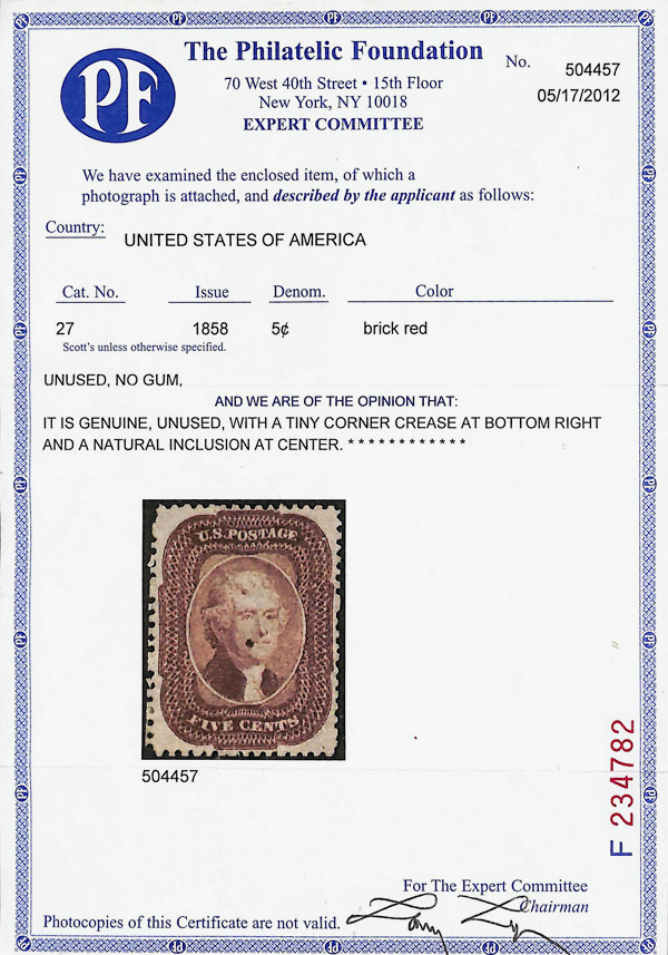 2374 ng 27 image1858, 5¢ brick red, type I (Scott 27), Retains full luster, unused without gum; tiny corner crease at bottom right and a natural inclusion at center, Very Fine, with 2012 P.F. certificate.