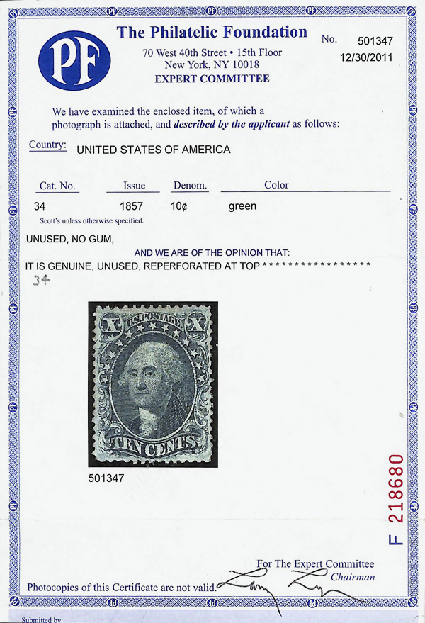 2383 ng 34 image1857, 10¢ green, type IV (Scott 34), Uncommonly fresh look, unused without gum; reperforated at top, Very Fine, with 2011 P.F. certificate.