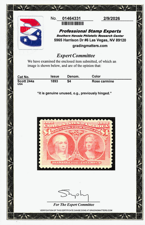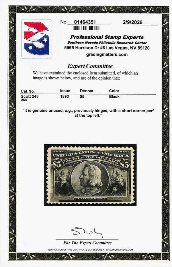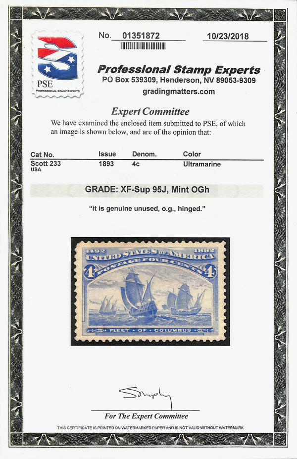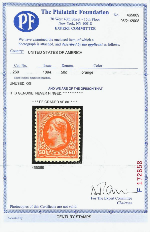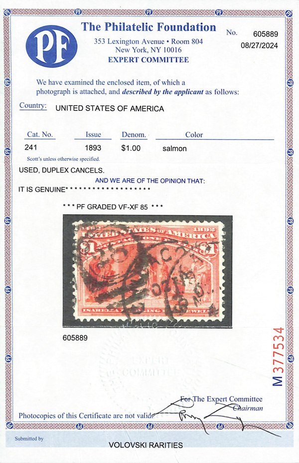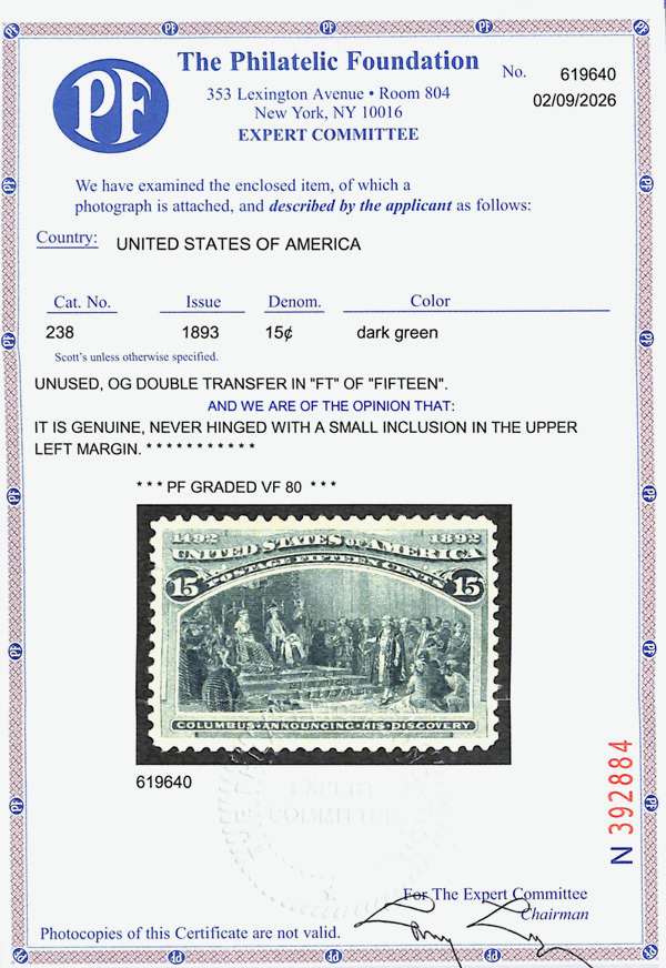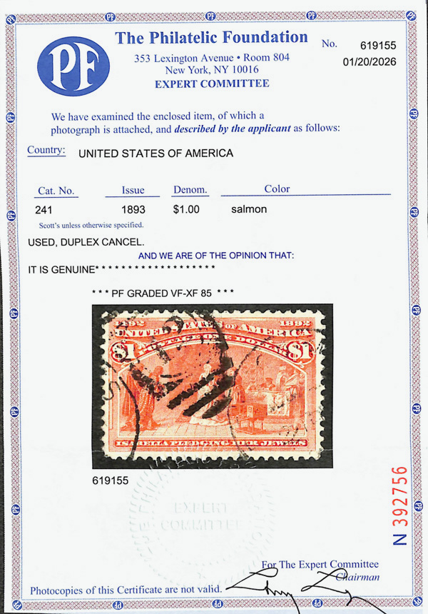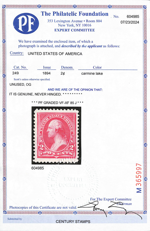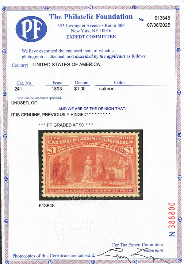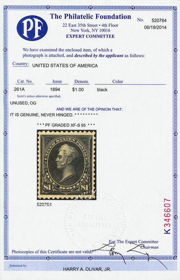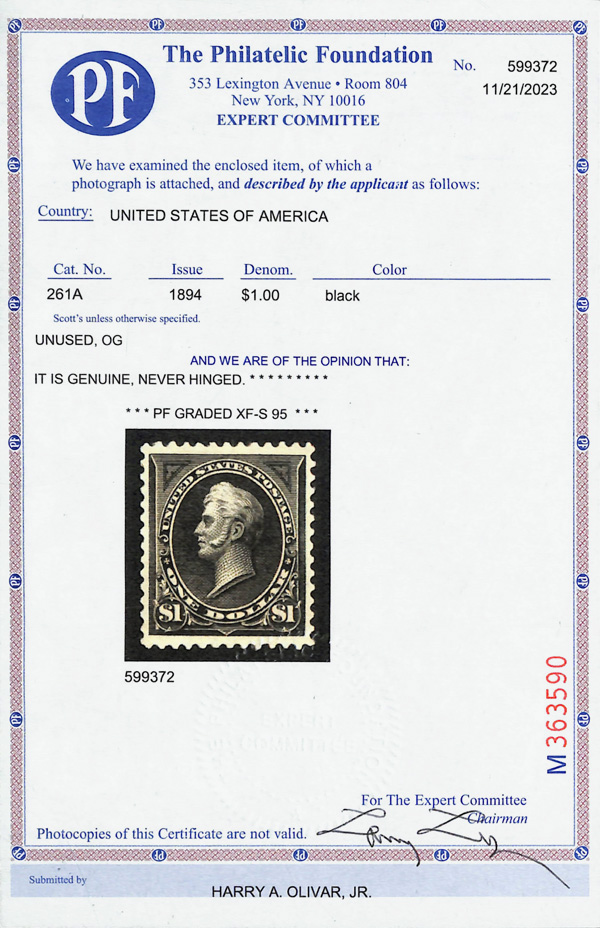 2002, 2014 and 2023 P.F. certificates, the last two graded XF-SUP 95. SMQ XF-SUP 95; $32,600. Scott Stamp Values $31,000.
