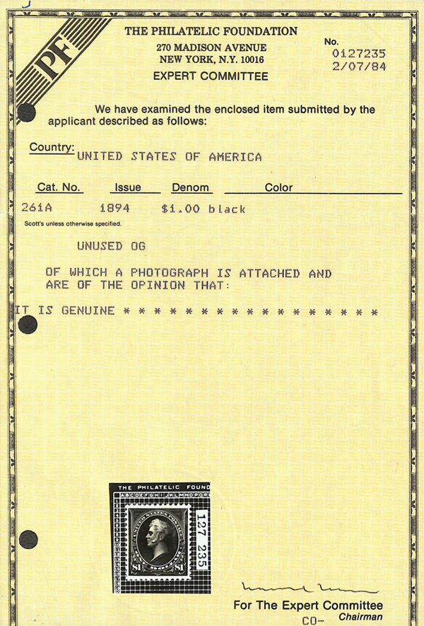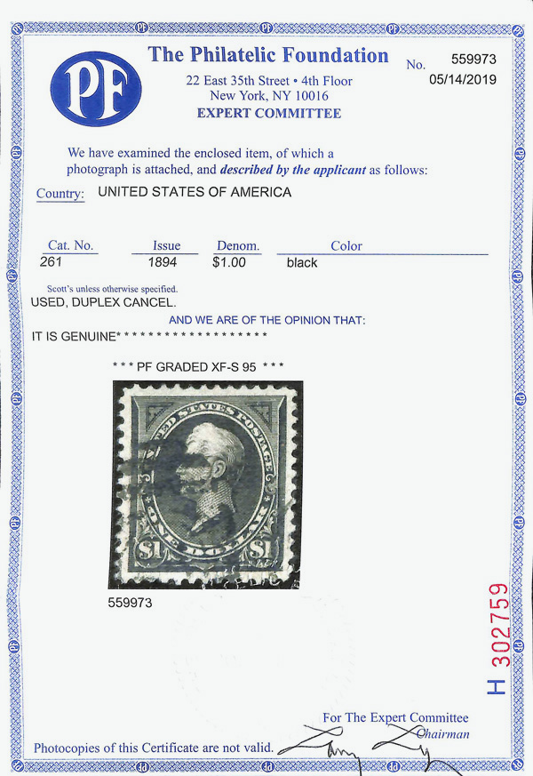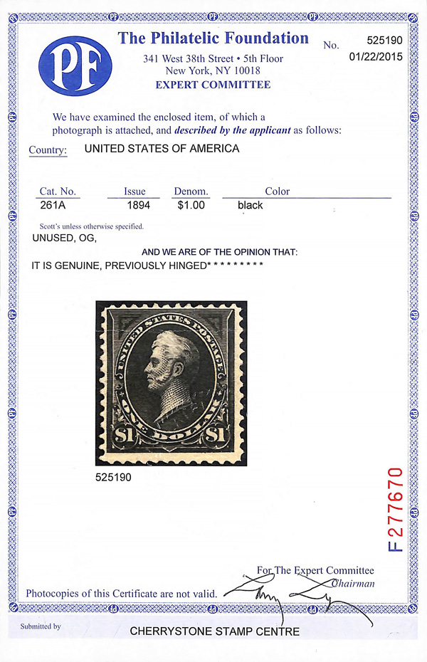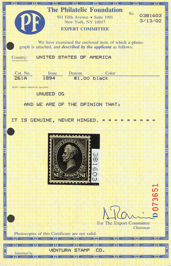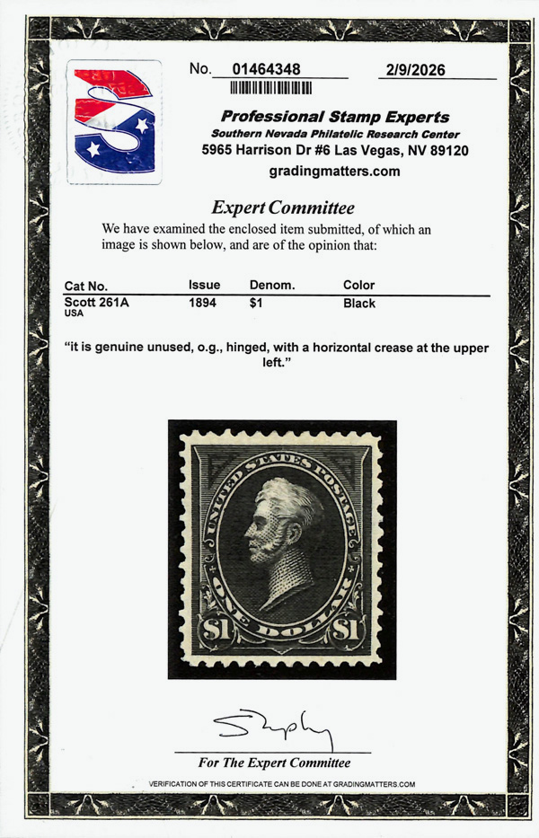 1894, $1 black, type II, unwatermarked (Scott 261A), o.g., never hinged, flawless in all respects, with sharp detail, bold,