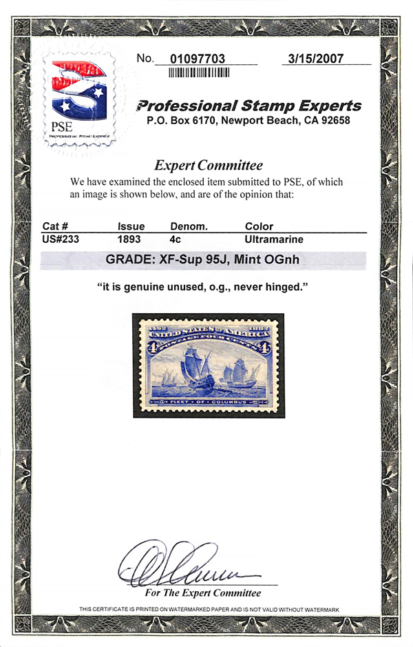 rich color, and centering as close to absolutely perfect as you could wish, Extremely Fine to Superb, the highest grade awarded a never hinged stamp by the P.F.; by comparison, the PSE's Population Report lists one 95 and one 95J, with 1984,