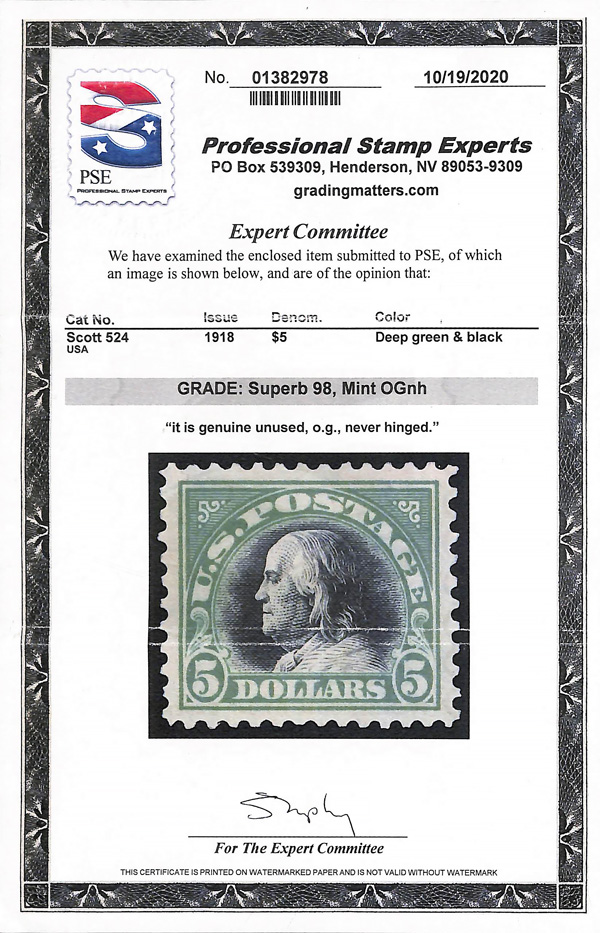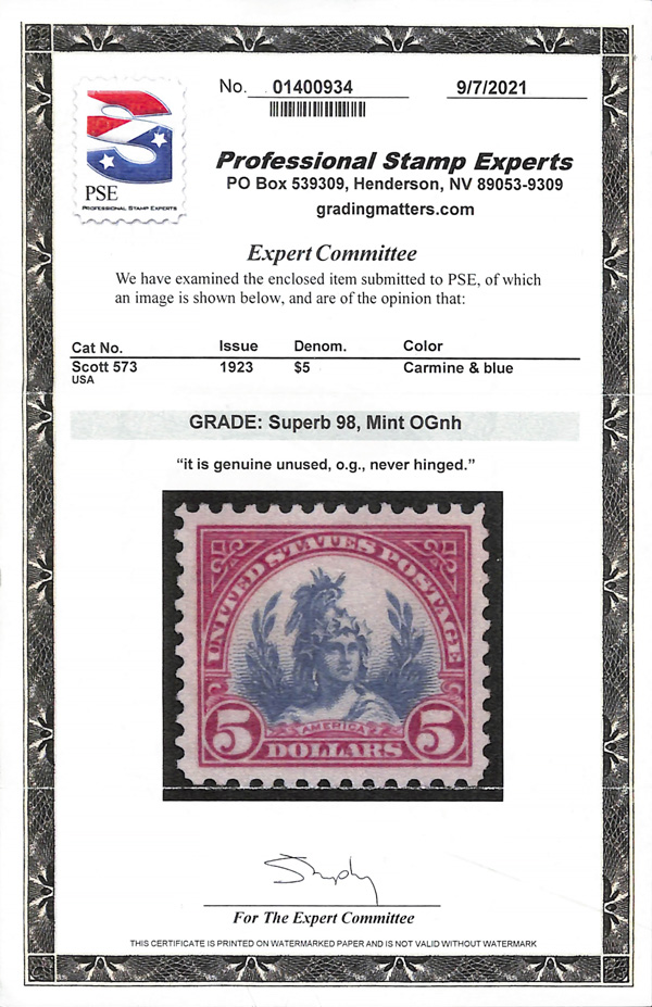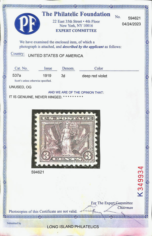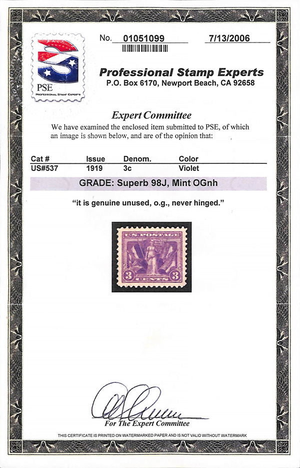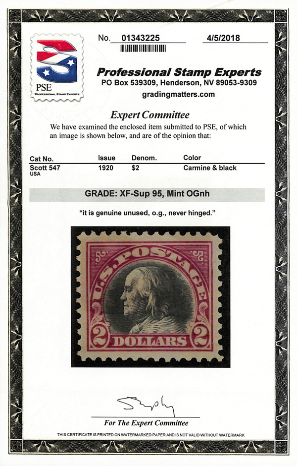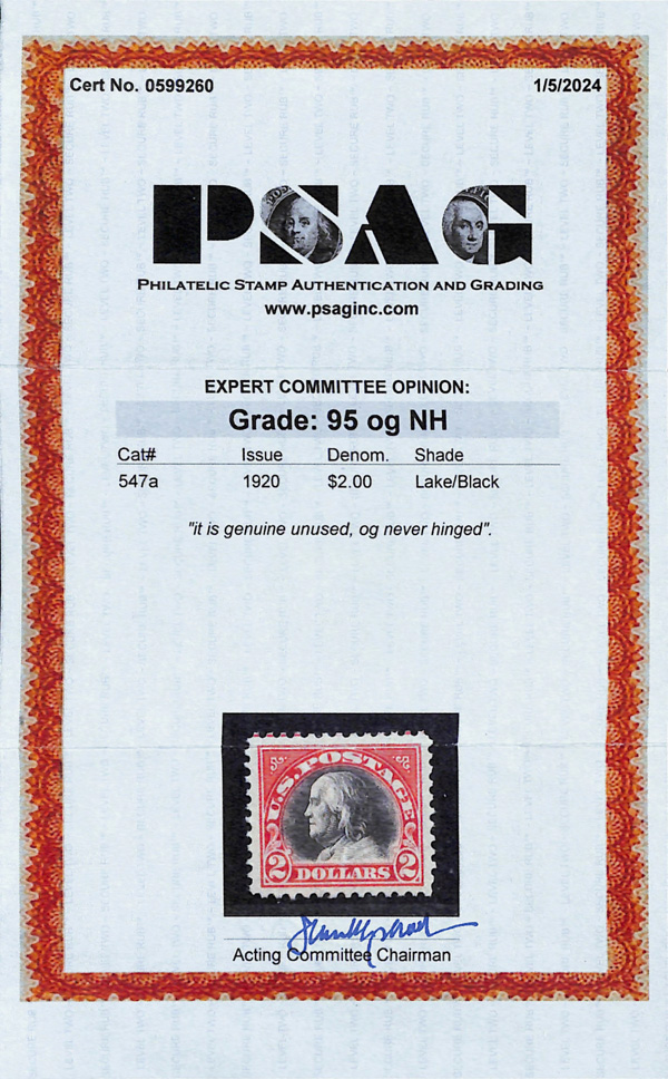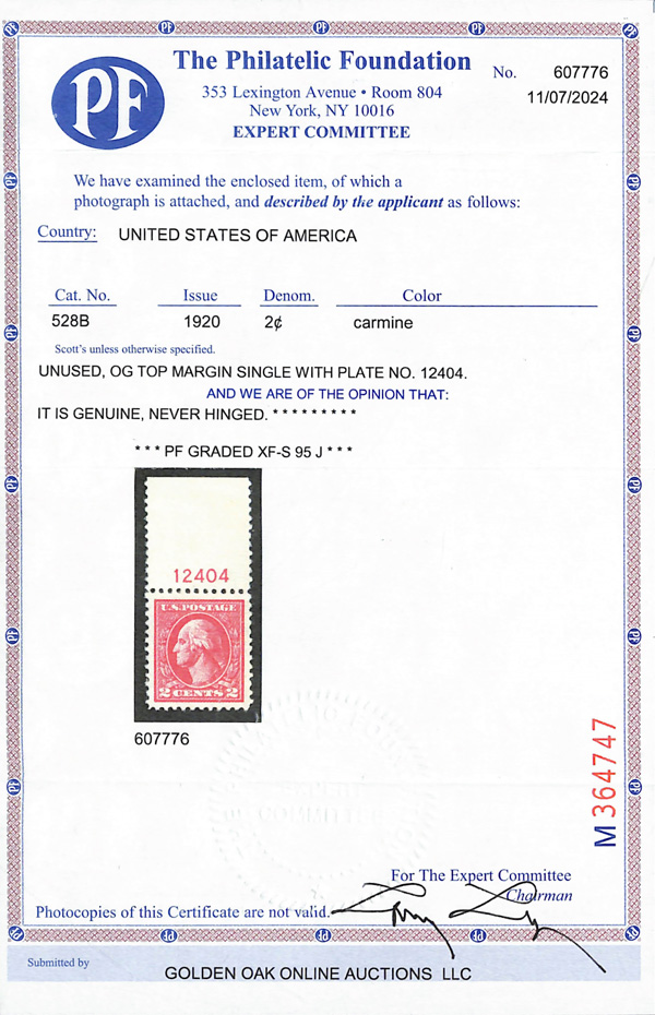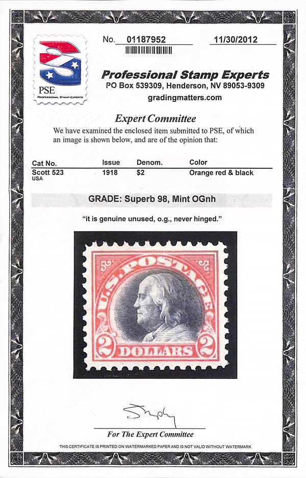 never hinged, a simply magnificent item, Post Office fresh and sound with large, balanced margins all around; well worth grading, Superb, with 2002 P.F. certificate. Scott $9,000. (Image) (Image2)
