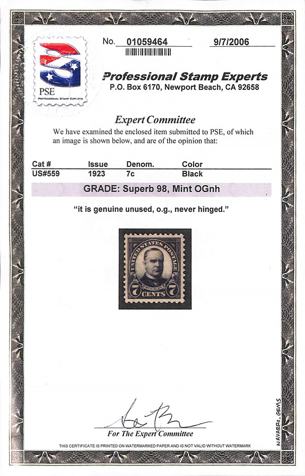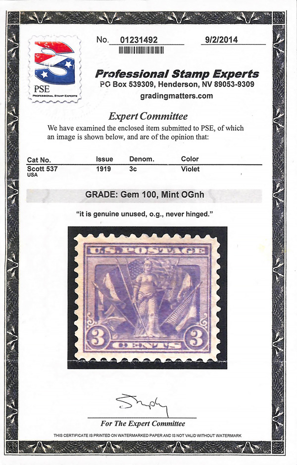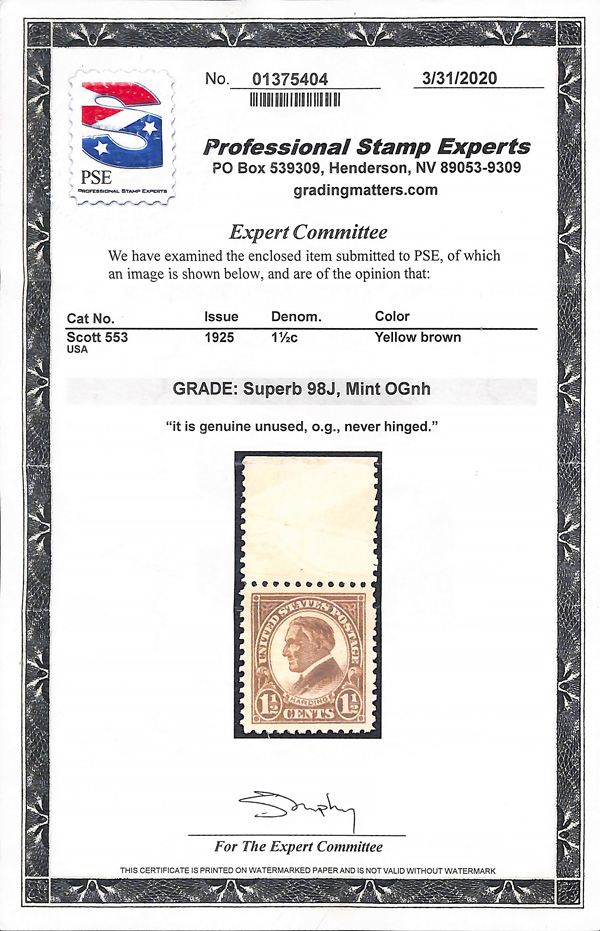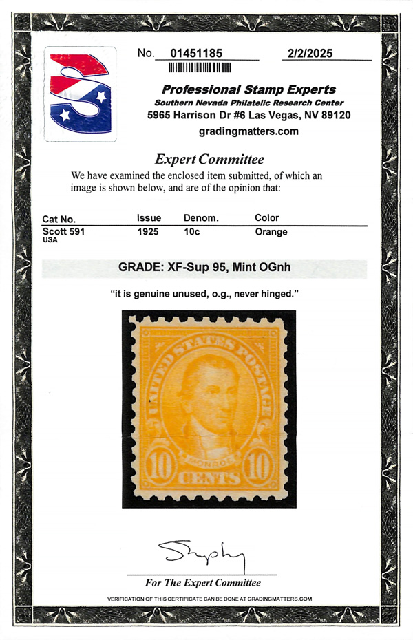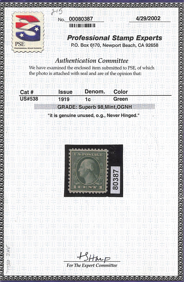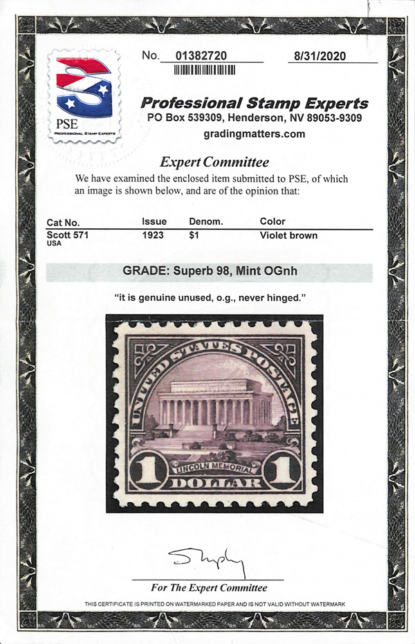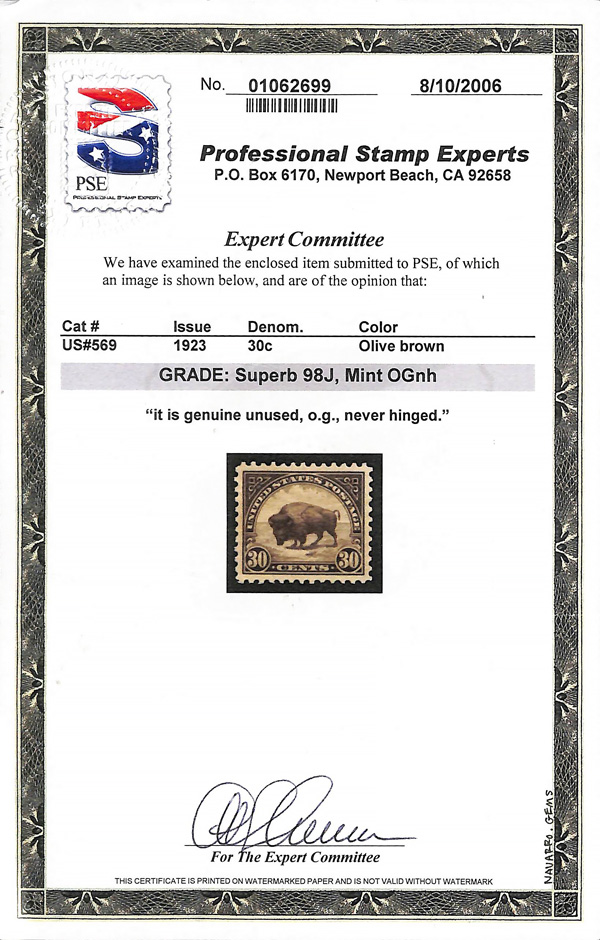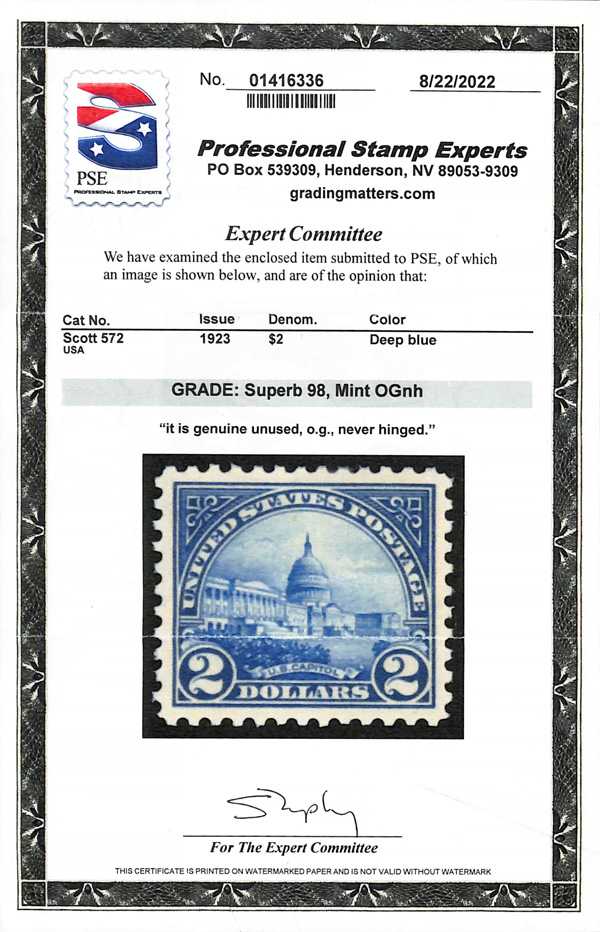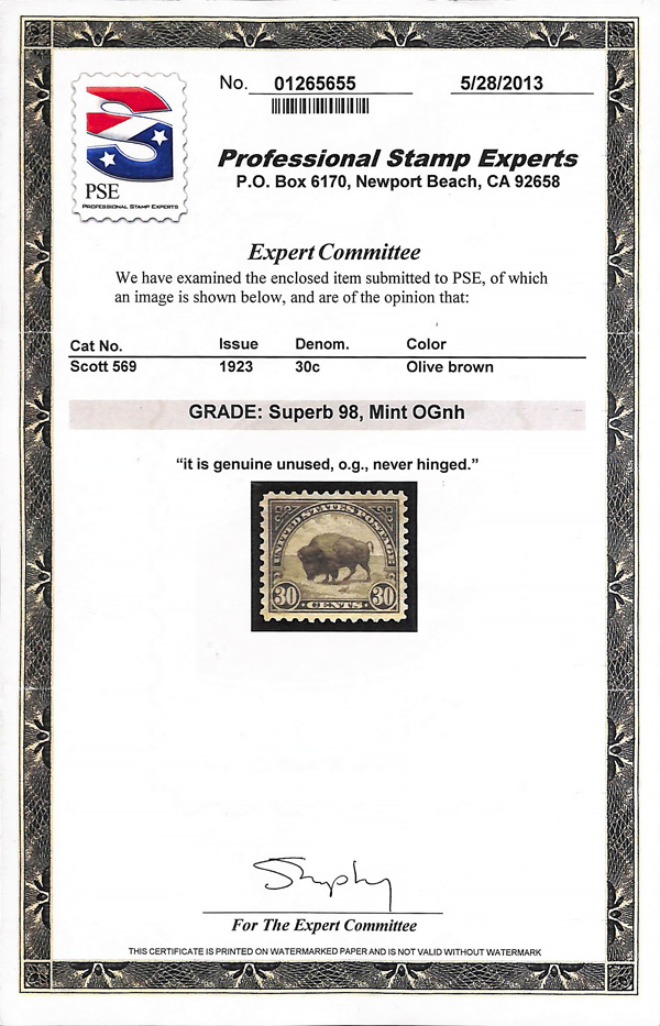 never hinged, a simply magnificent item, Post Office fresh and sound with large, balanced margins all around; well worth grading, Superb, with 2002 P.F. certificate. Scott $9,000. (Image) (Image2)
