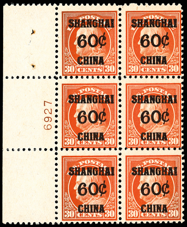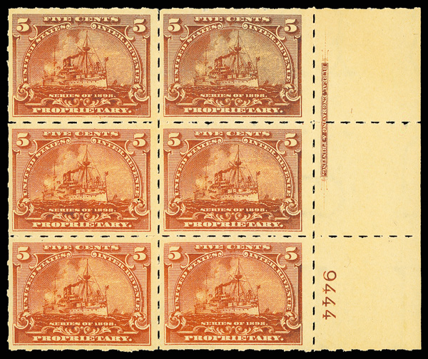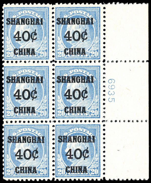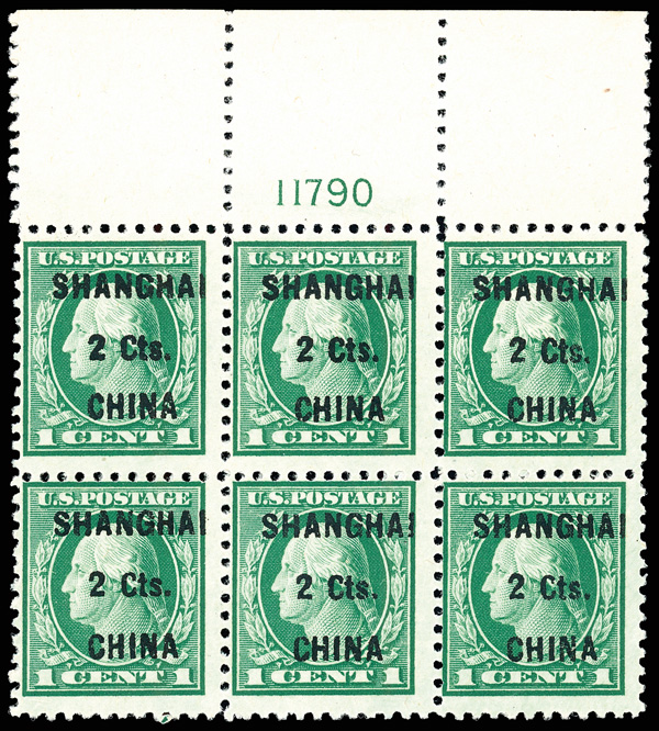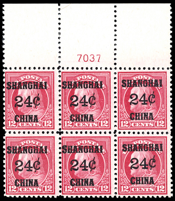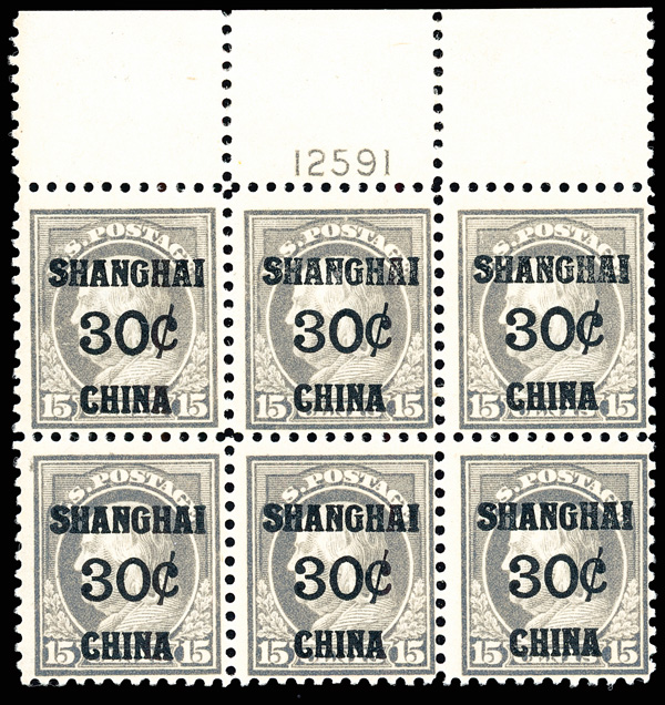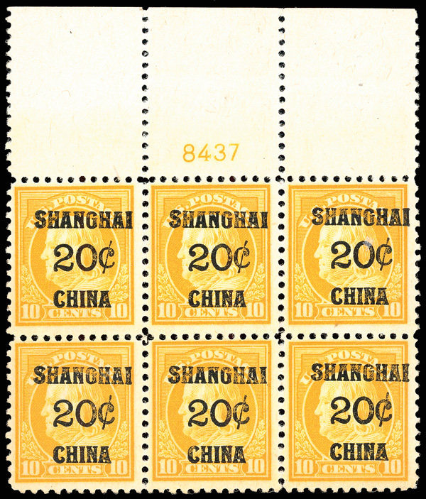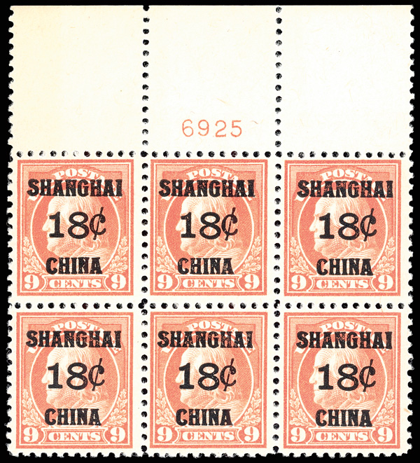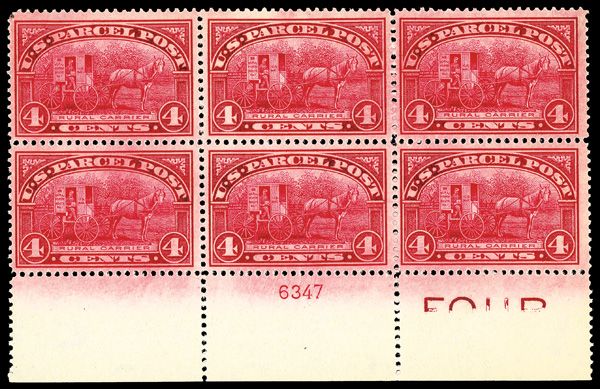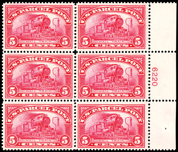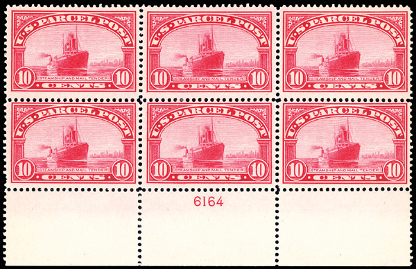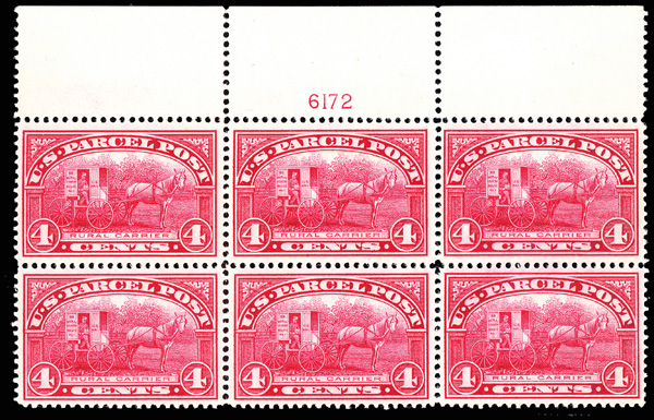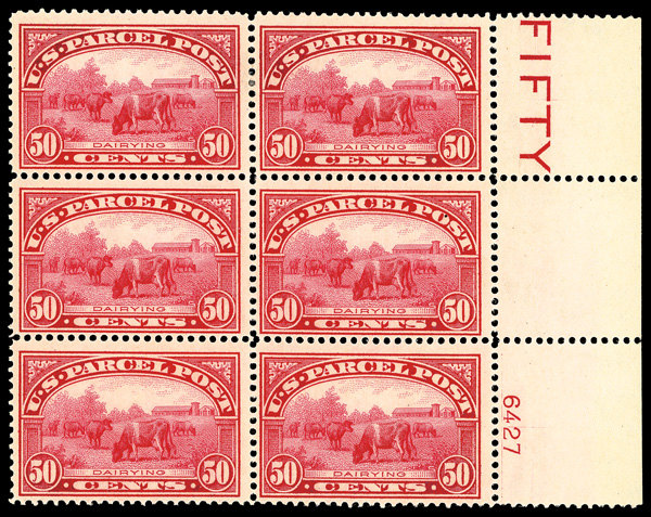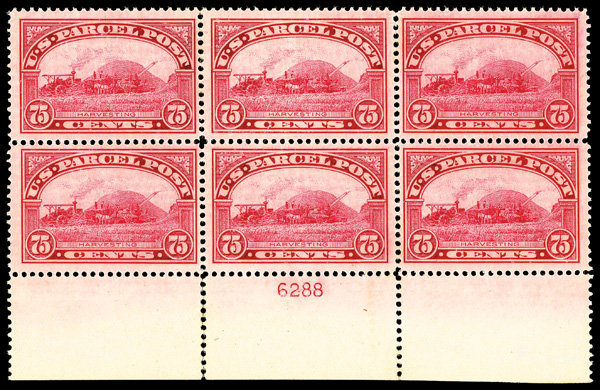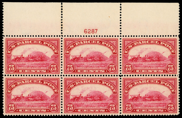 Parcel Post, 1913, 75¢ Harvesting (Scott Q11), full top margin plate number 6287 block of 6, o.g., lightly hinged,