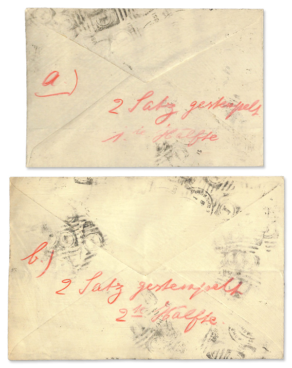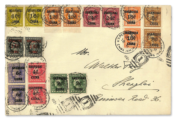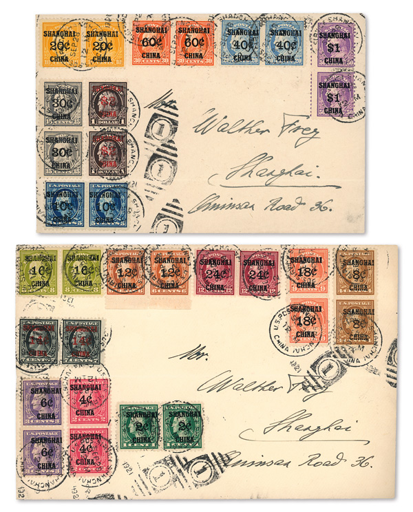 vertical) with each stamp tied by "U.S. Pos. Service, Shanghai, China, Sep. 28, 1921" duplex datestamp, on 2 covers to Walther Frey in Shanghai, Nos. K1-K4 & K6-K9 & K11 on the larger cover (sealed) and Nos. K5, K10, K12-K16 on the smaller cover