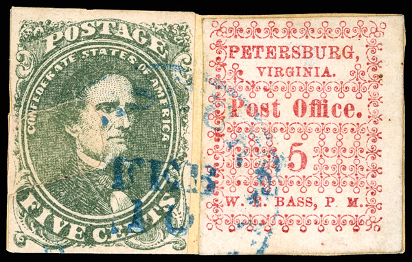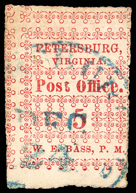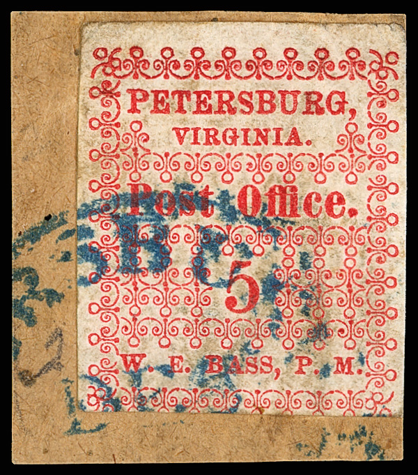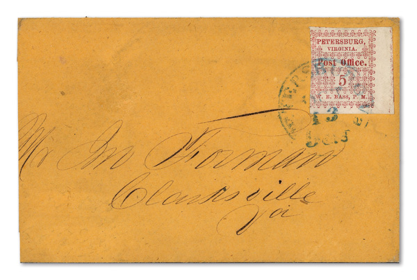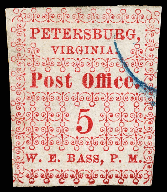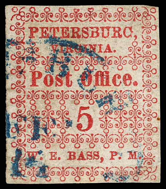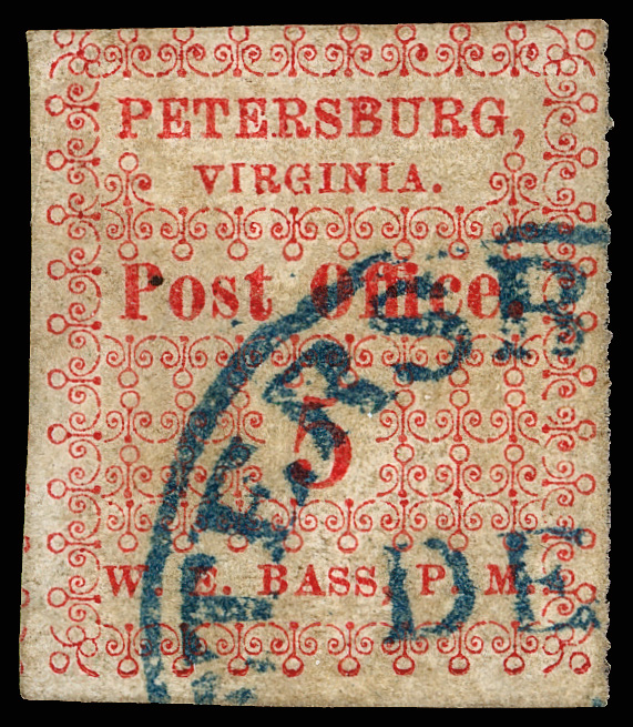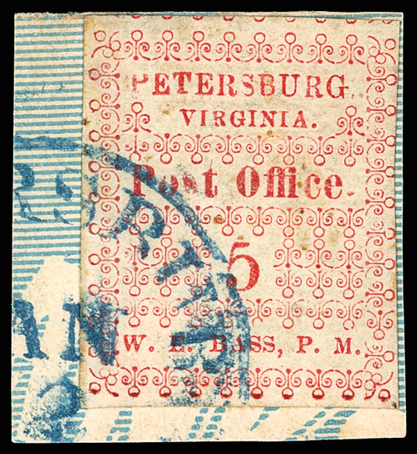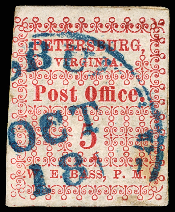 with enormous top left corner selvage and full to large margins bottom and right, latter with huge top selvage and full to huge margins with traces of ornaments of neighboring stamp at right, canceled by blue "Petersburg Va. Sep. 24" Type A circular