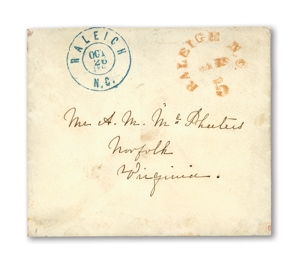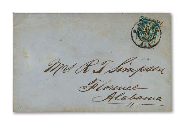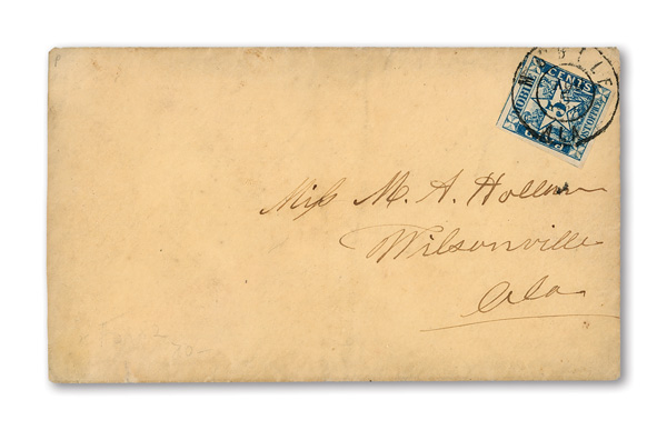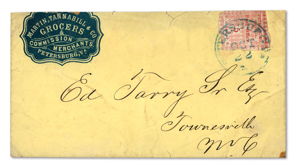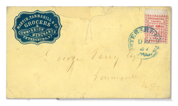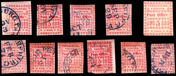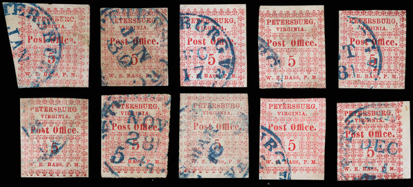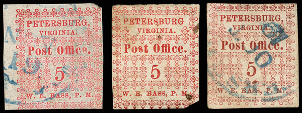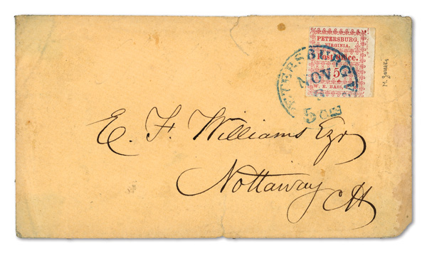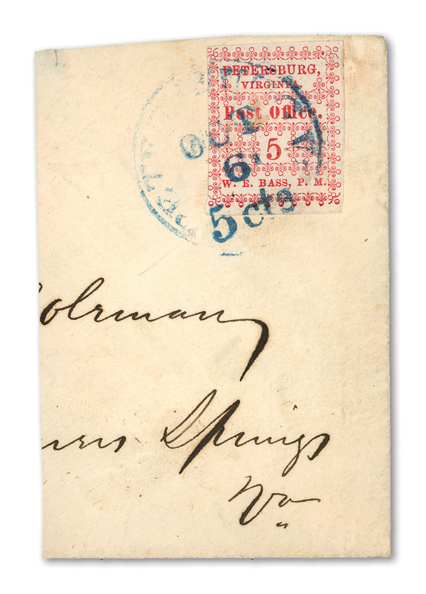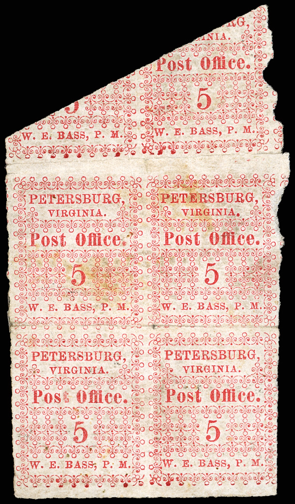 with enormous top left corner selvage and full to large margins bottom and right, latter with huge top selvage and full to huge margins with traces of ornaments of neighboring stamp at right, canceled by blue "Petersburg Va. Sep. 24" Type A circular