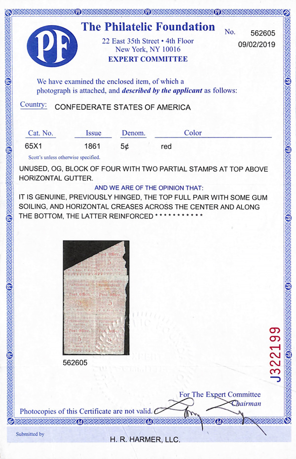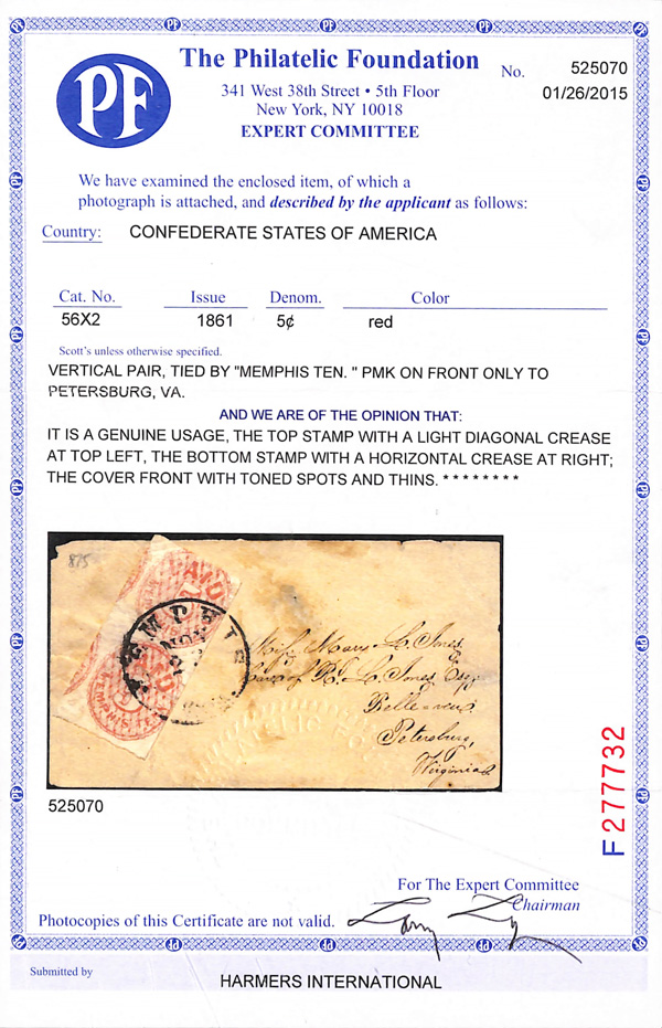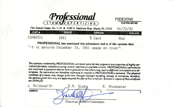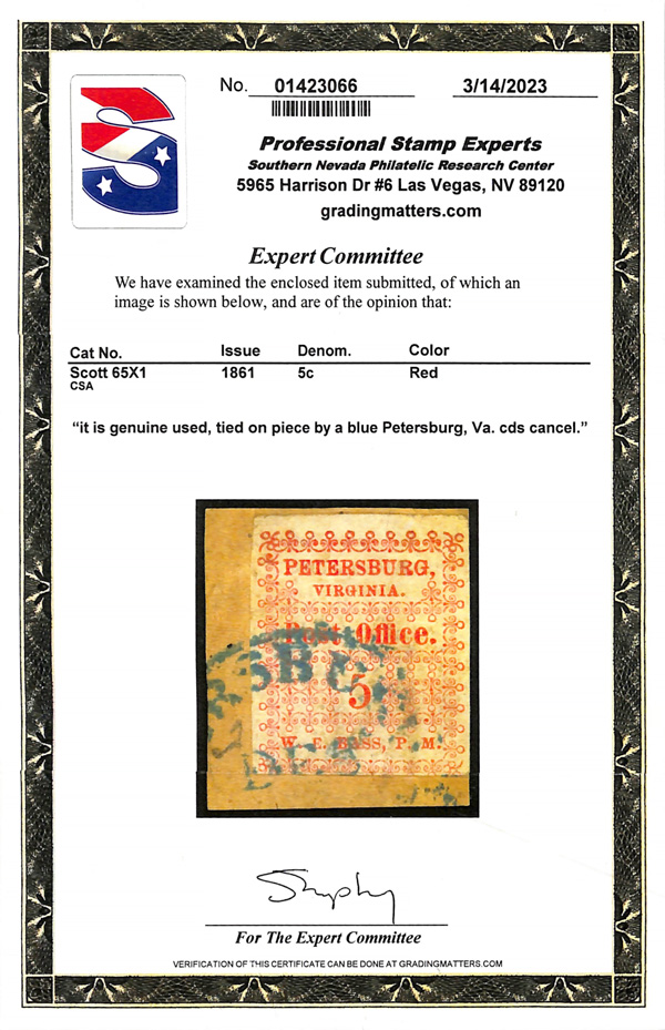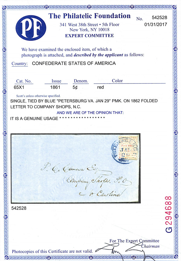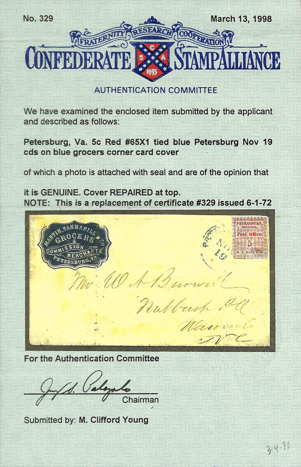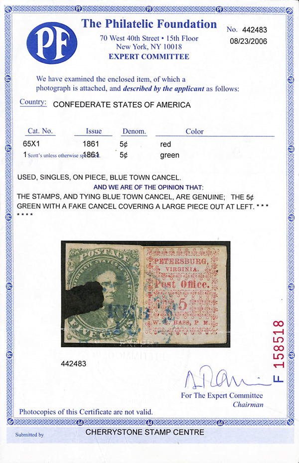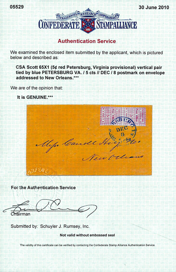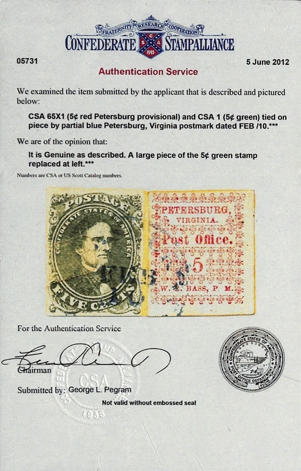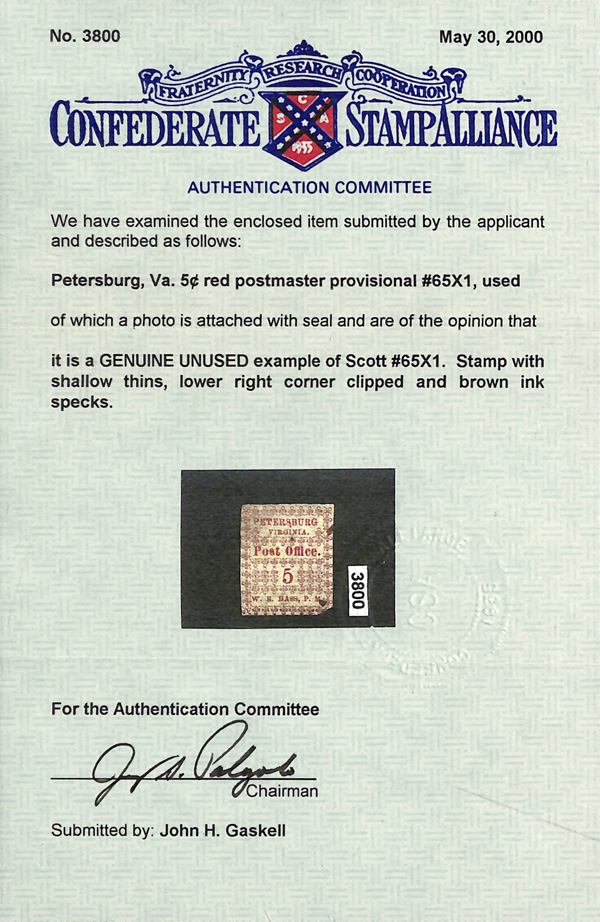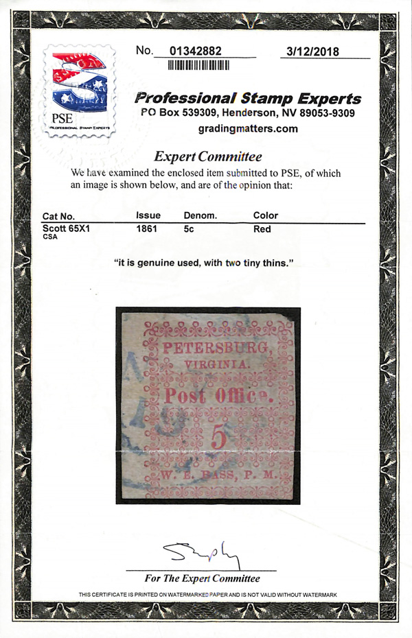 Caspary, Brandon, Weinberg (where purchased by the consignor). C.S.A. Catalog PET-VA-A01. (Image)