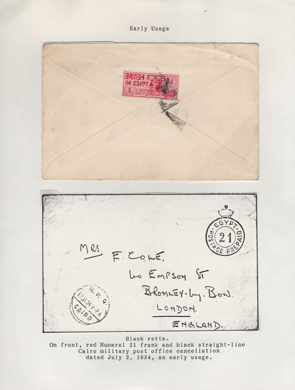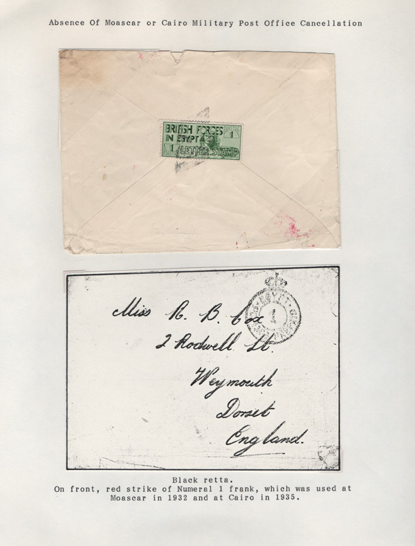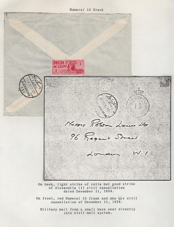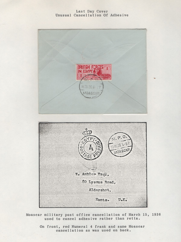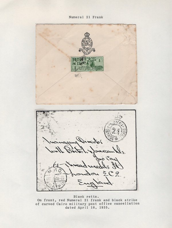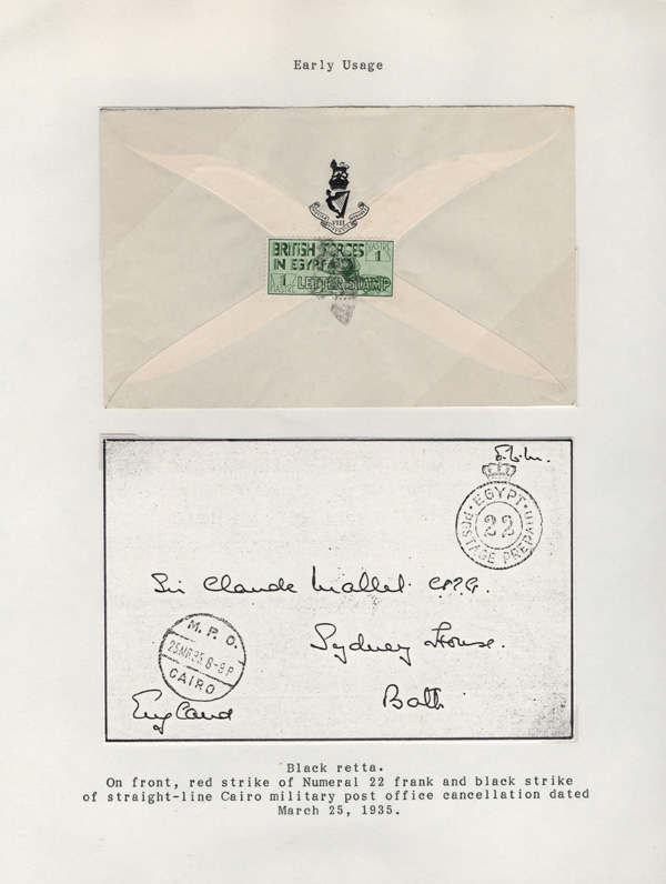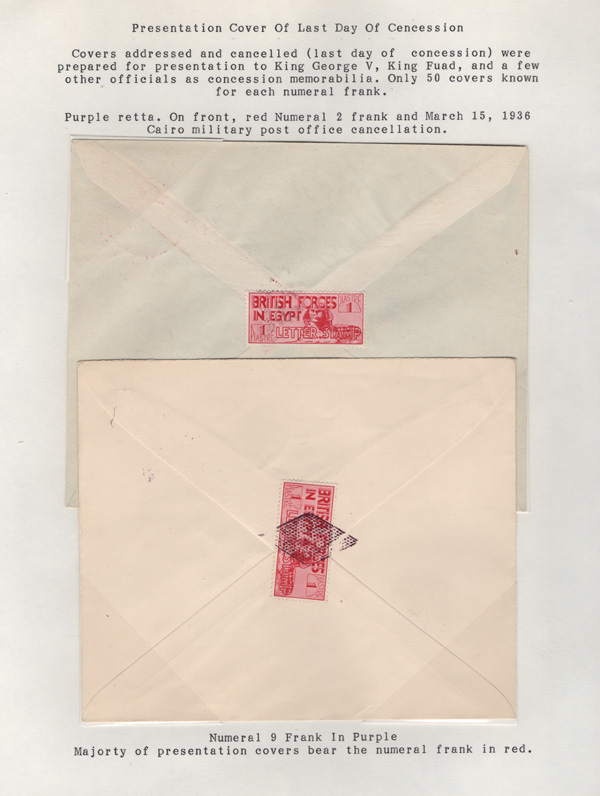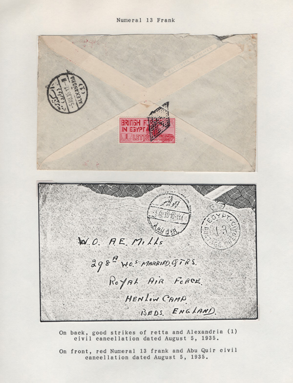 validity, Mar 15, 1936, after the Issue of regular Egyptian Military Postage stamps, on March 1. The covers all bear a Crowned Circle numeral frank including #2 (M.P.O. Cairo), 3 (Alexandria Military Post Office), 4 (M.P.O. Moascar), 9 (M.P.O. Cairo,