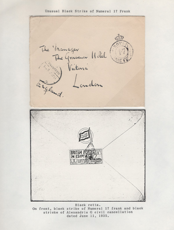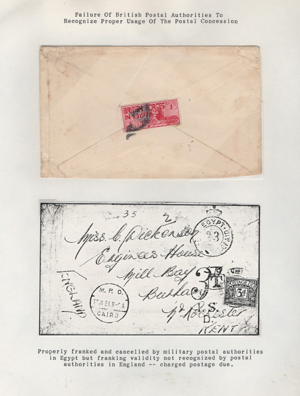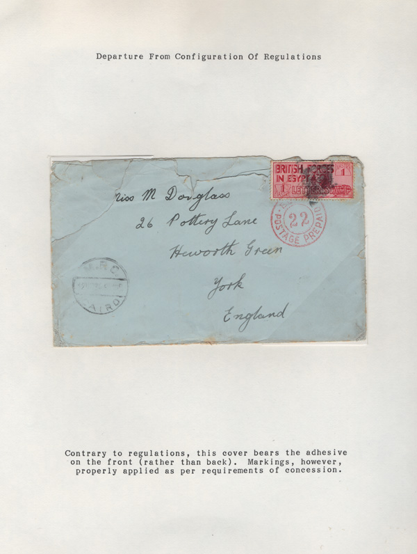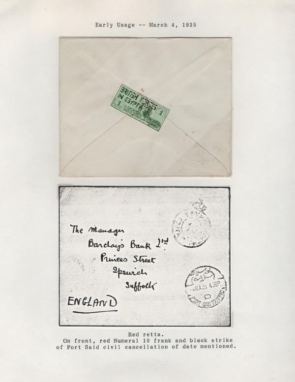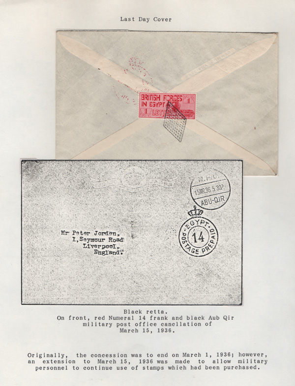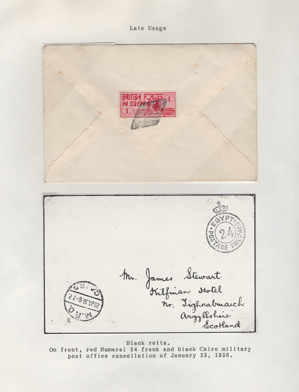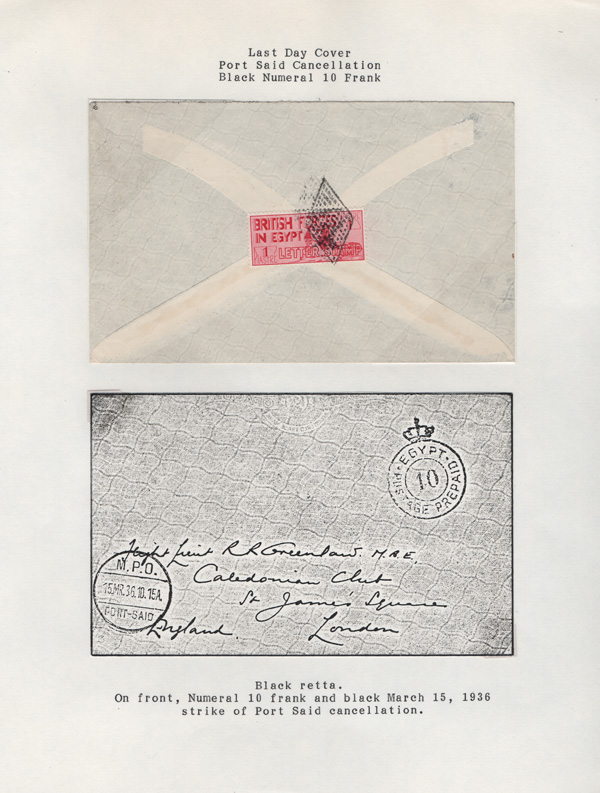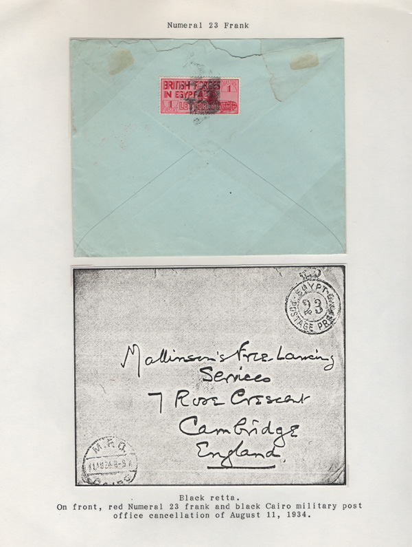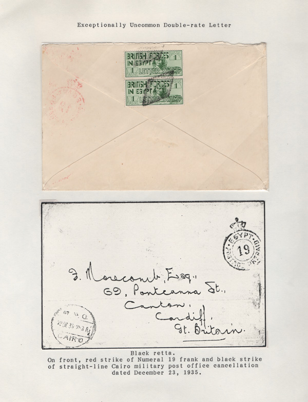 validity, Mar 15, 1936, after the Issue of regular Egyptian Military Postage stamps, on March 1. The covers all bear a Crowned Circle numeral frank including #2 (M.P.O. Cairo), 3 (Alexandria Military Post Office), 4 (M.P.O. Moascar), 9 (M.P.O. Cairo,