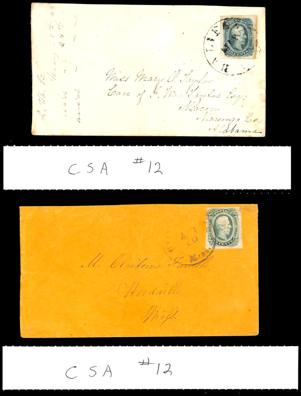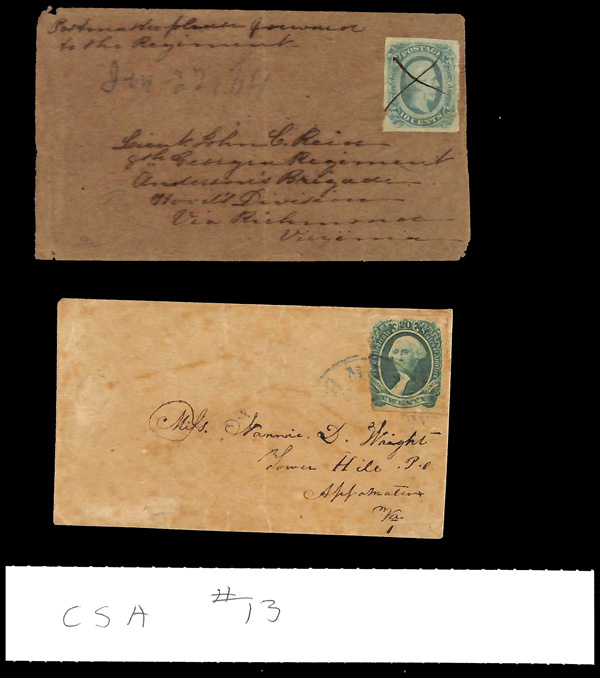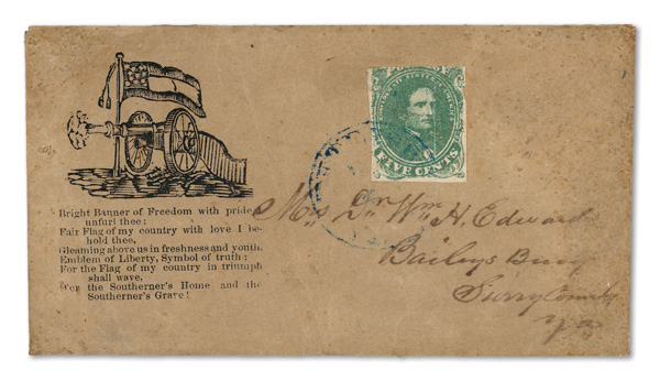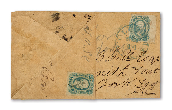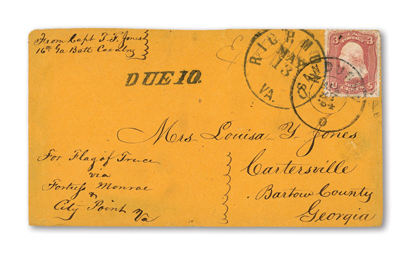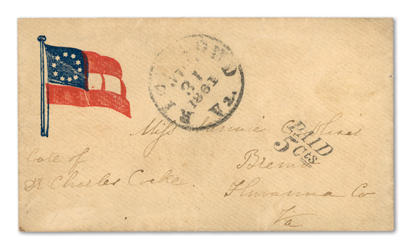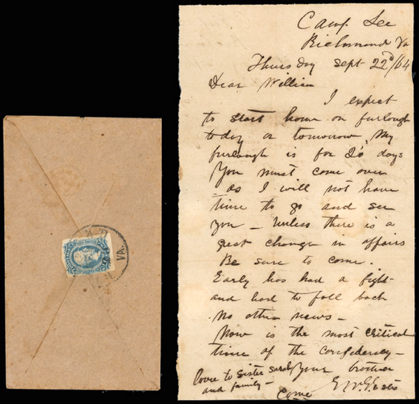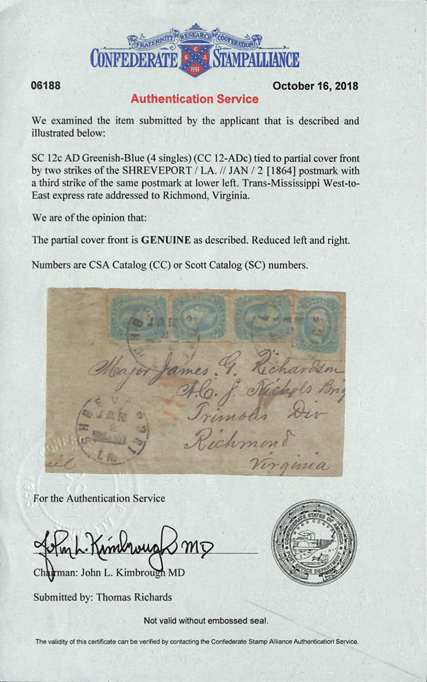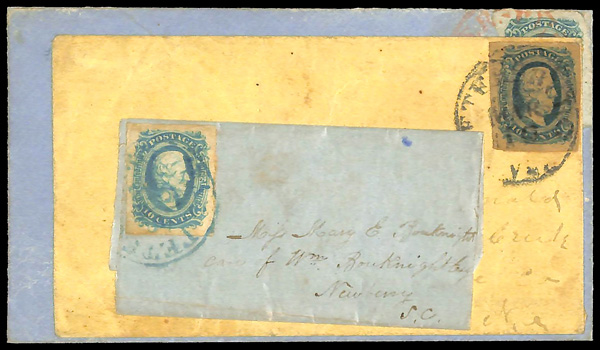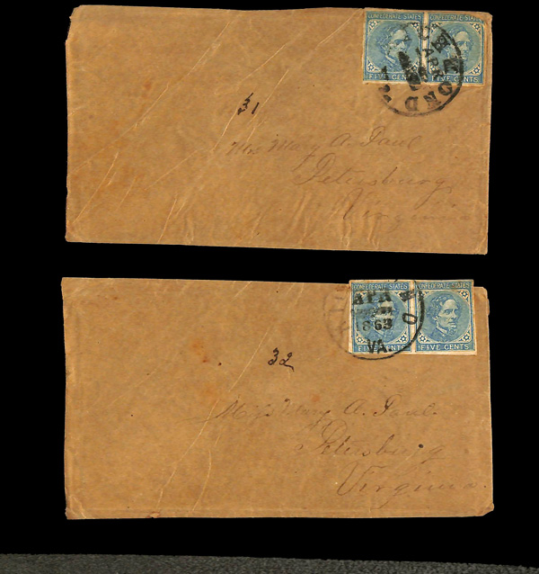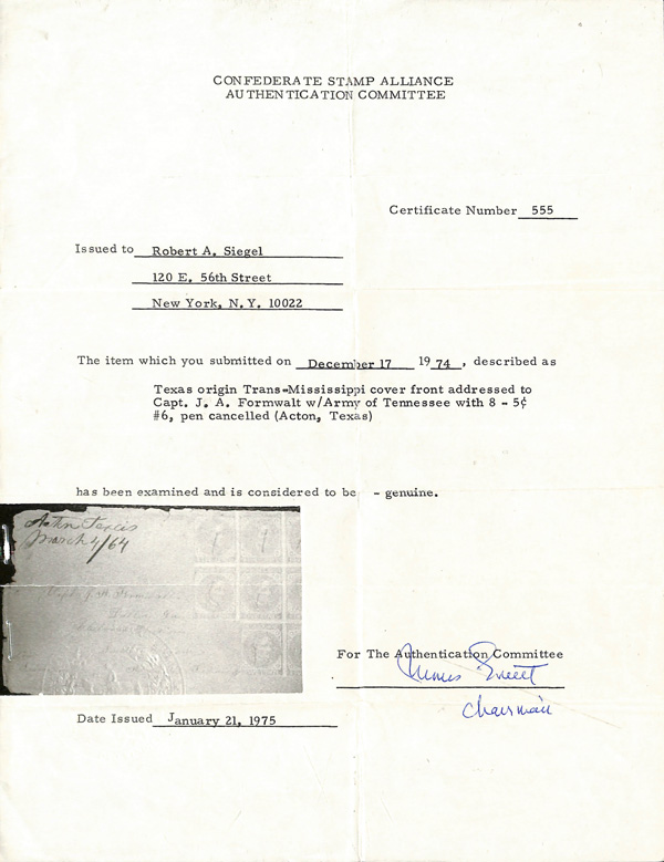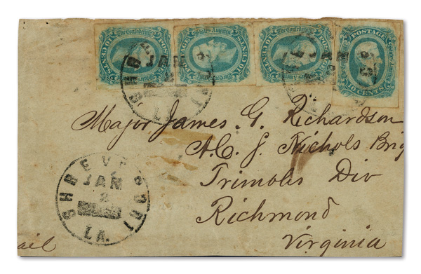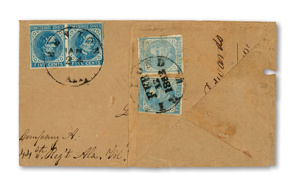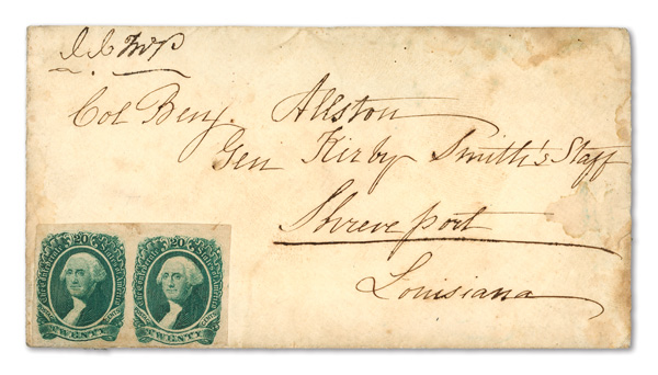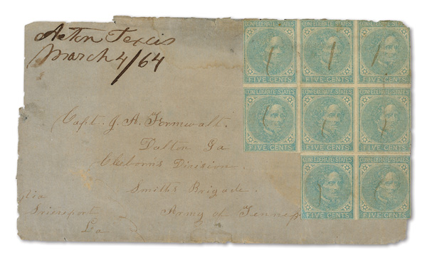 stamps with individual vertical pen cancel, "Acton Texas March 4/64" manuscript postmark at top left on gray cover front addressed to Capt. J.A. Formwalt, Dalton Ga. Cleburne's Division, Smith's Brigade, Army of Tennessee", manuscript "Via Shreveport