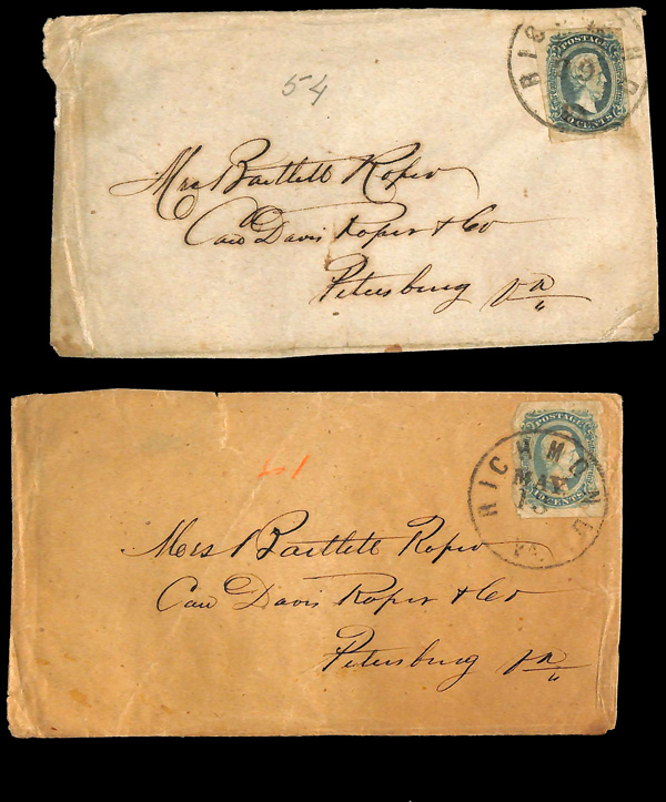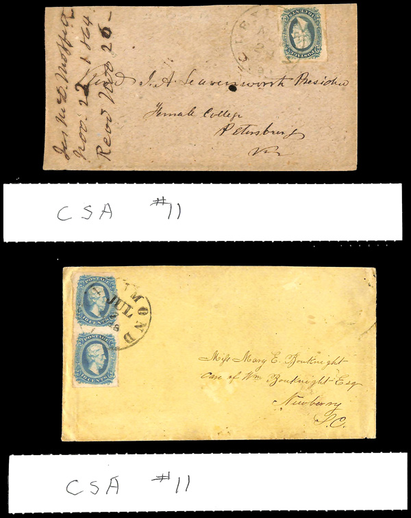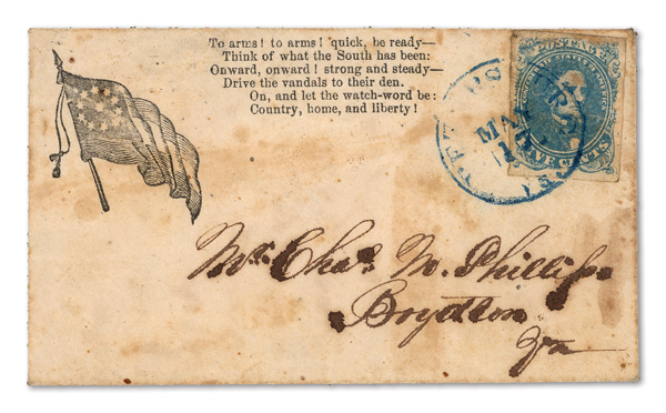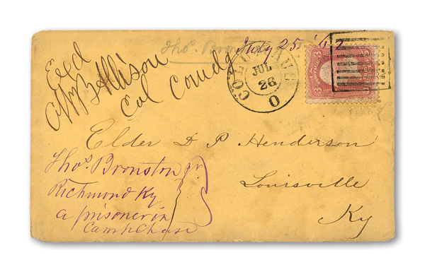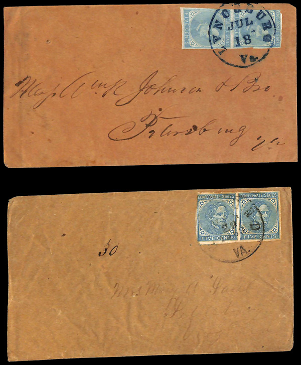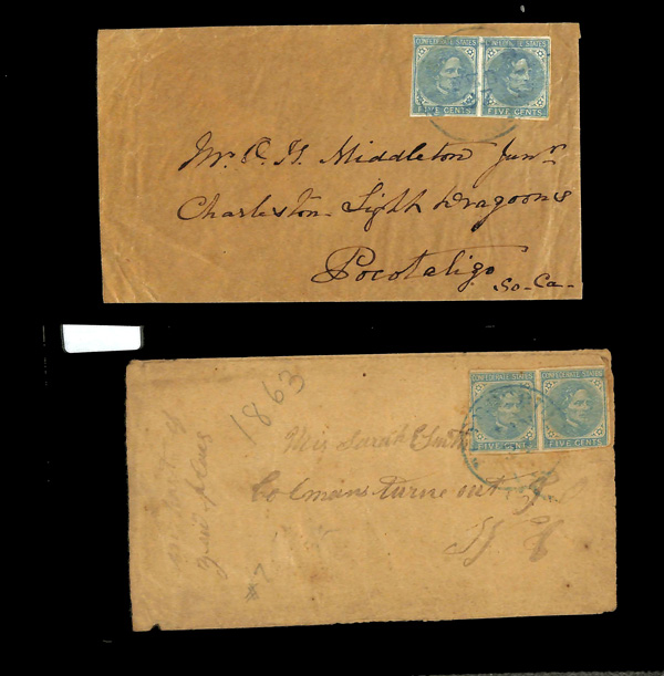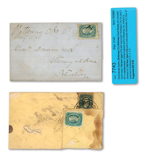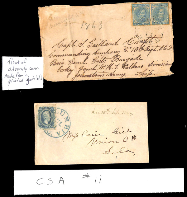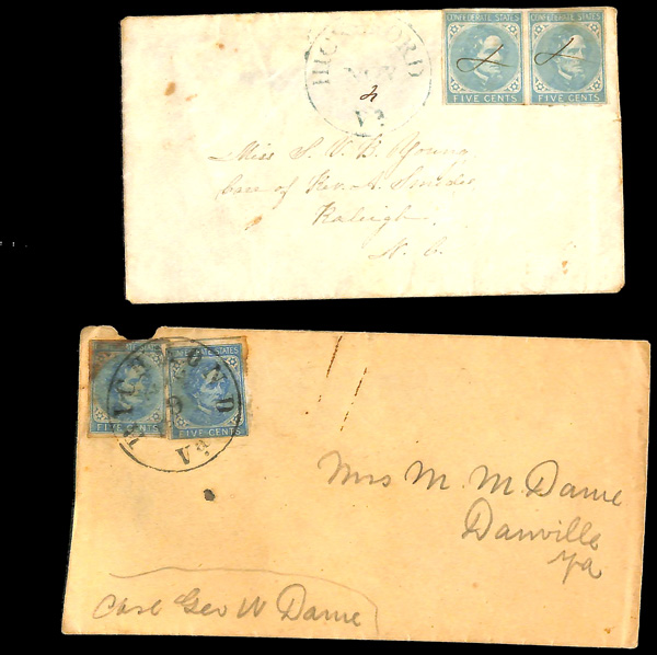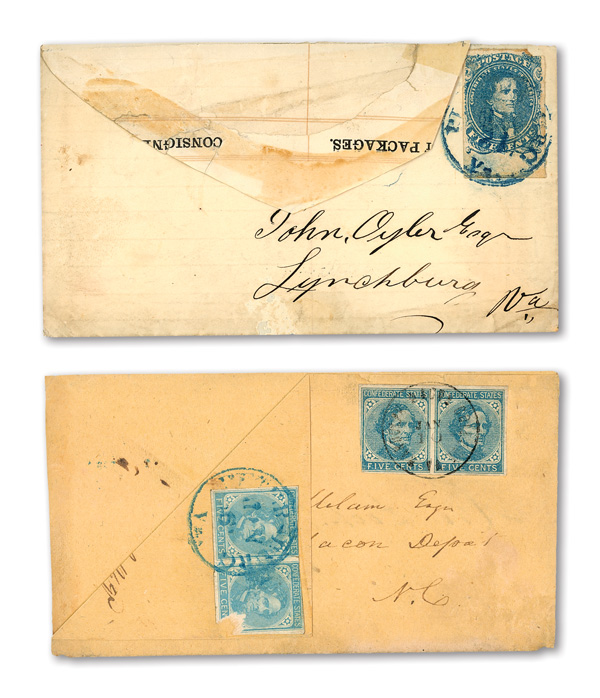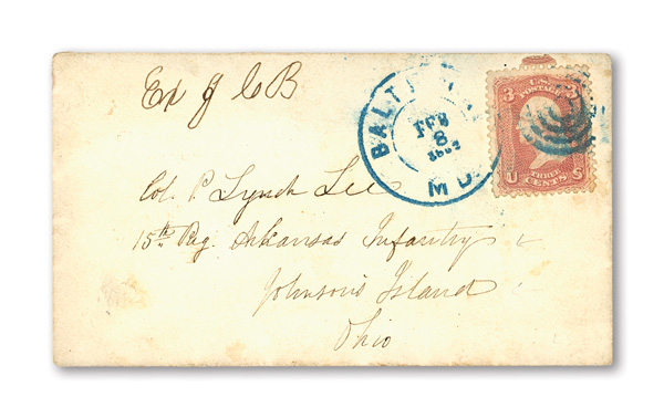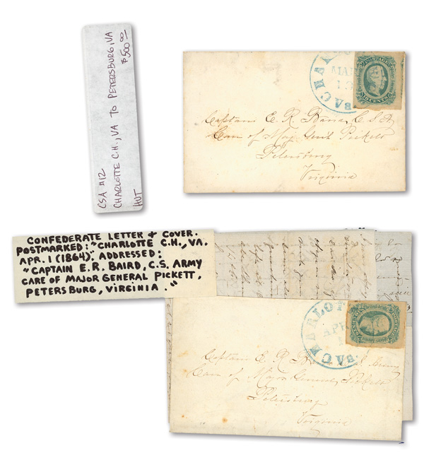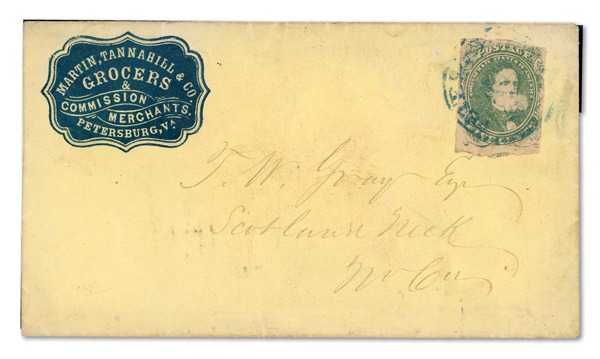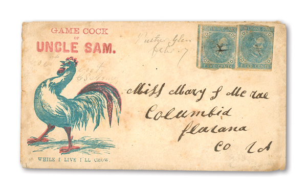 stamps with individual vertical pen cancel, "Acton Texas March 4/64" manuscript postmark at top left on gray cover front addressed to Capt. J.A. Formwalt, Dalton Ga. Cleburne's Division, Smith's Brigade, Army of Tennessee", manuscript "Via Shreveport