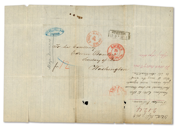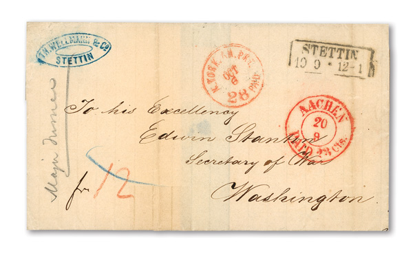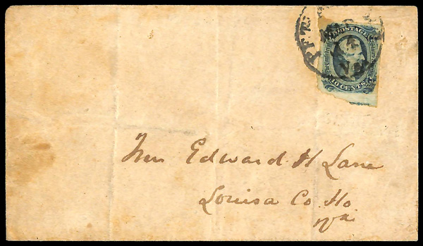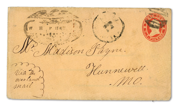 1864, West to East Trans-Mississippi Cover Front, franked by #7 block of 6 and horizontal pair (originally a block of 8),