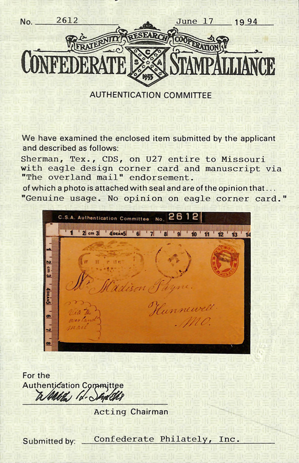 probably because this is a cover front, it is neither listed nor priced in the Eastbound listings in the C.S.A. Handbook., with 1975 C.S.A. certificate (stating #6).