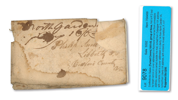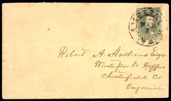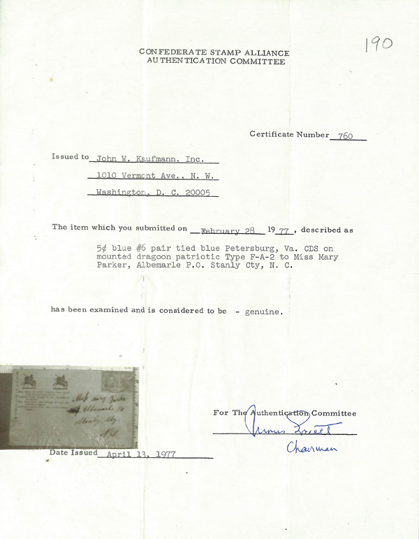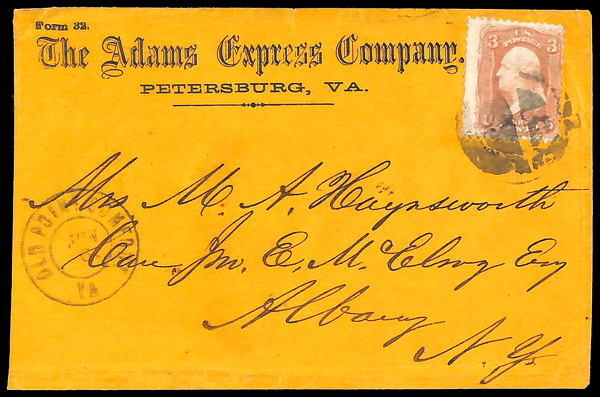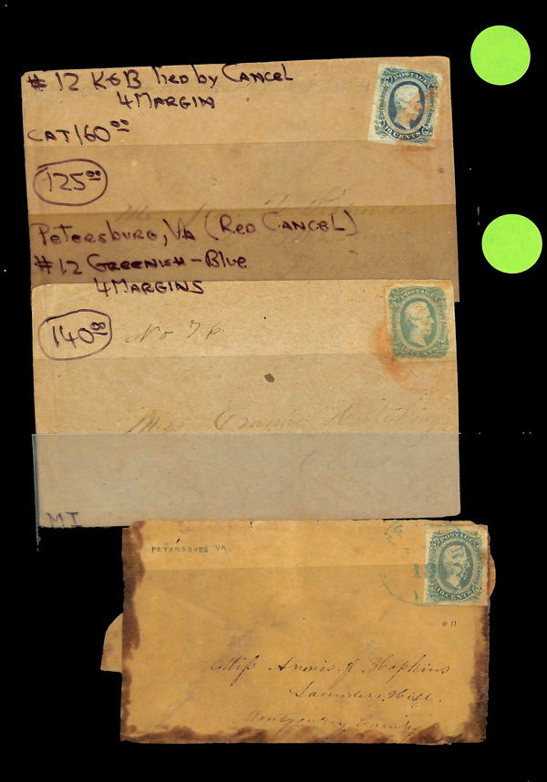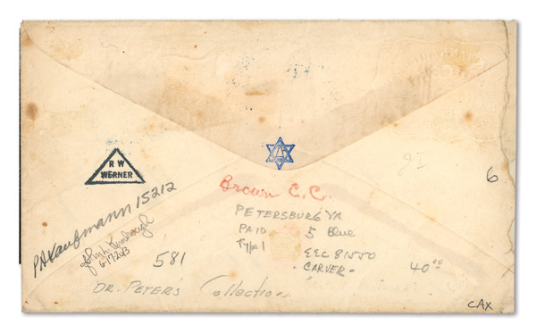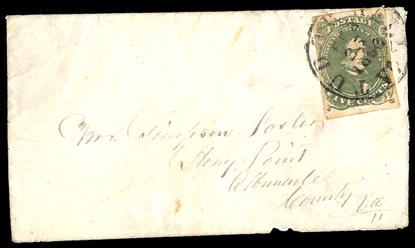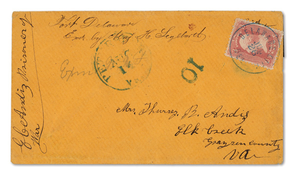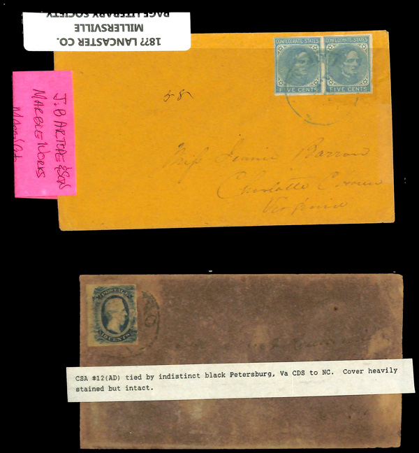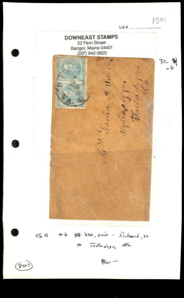 traveled West to East. This is #W5 in his census. We observed that of the 27 listed, only 2 are franked with #7, 1 is partially franked with #7 and none are franked with #6. A copy of his census accompanies this cover. For some unknown reason,