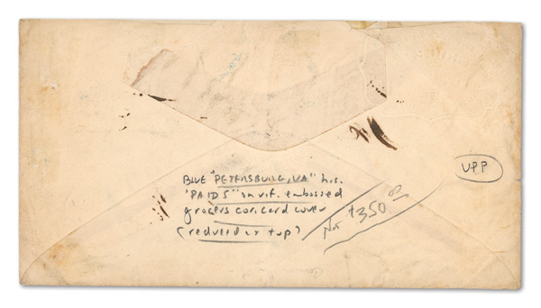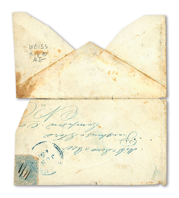 La." at bottom left; edgewear affects top left stamp and slightly affects others, Fine, this is a very rare West to East Trans-Mississippi cover front with 40¢ postage paid. Richard Krieger recorded 27 "positive" Trans-Mississippi covers that