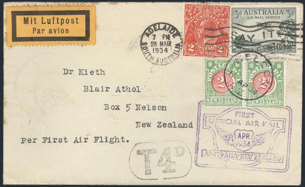 1384 116, C1 image116, C1, Tied by Adelaide 28 Mar, 1934 cancel on cach FFC Australia to New Zealand. The cover was short paid and has a pair of New Zealand Postage Due stamps affixed & cancelled by Nelson 13 Ap, '34 CDS. F (Image) Estimate 50.00+ $Cdn