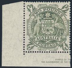 1398 221 image221, LL corner margin single of the £2 Arms having the ROLLER FLAW BELOW "E" OF "POSTAGE" variety. VF, LH. A nice positional example of this scarce variety (SG #224da, Cat £180) (Image) Estimate 150.00+ $Cdn