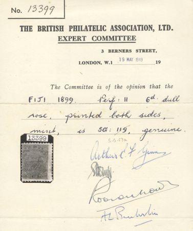 2044 43e image43e, Rare 6d VR issue PRINTED ON BOTH SIDES, F-VF, OG, LH on gummed side. A VERY SCARCE AND DISTINCTIVE ERROR - ONLY A HANDFUL ARE THOUGHT TO EXIST. Has 1949 BPA Certificate which is signed by expert Robson Lowe & others. Ex Gillis (Image) (View Certificate)