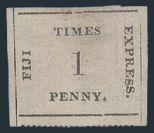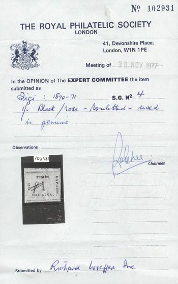 2039 5 image5, Scarce One Shilling showing roulette at top, neat manuscript "#" cancel of Levuka. Gillis Paper Type 1, Position 7. F. Has 1977 Royal Philatelic Society Certificate. Ex Gillis (Image) (View Certificate)