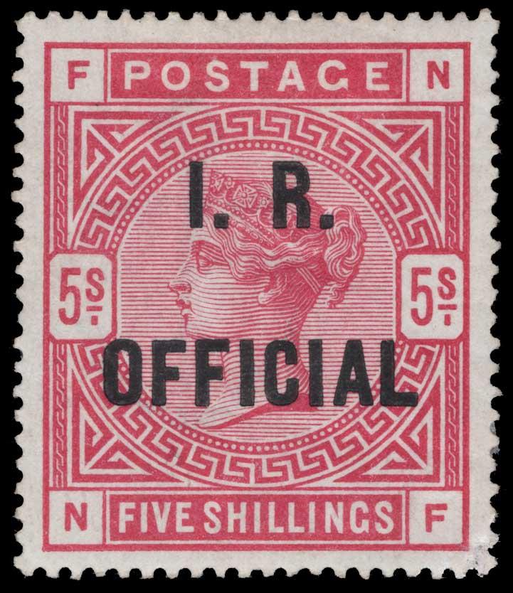Lot 4195 - Great Britain GREAT BRITAIN, 1885, 5sh CARMINE ROSE "I.R. OFFICIAL" - OVERPRINT IN BLUE BLACK - MINT, #O8 var., well-centered, previously hinged, bottom right corner perf added, very fine, with 2025 Wenvoe cert., unlisted with blue black overprint in Scott, 2026 Gibbons #O9b @ £14,000.00....US$500 Currently US$ 500