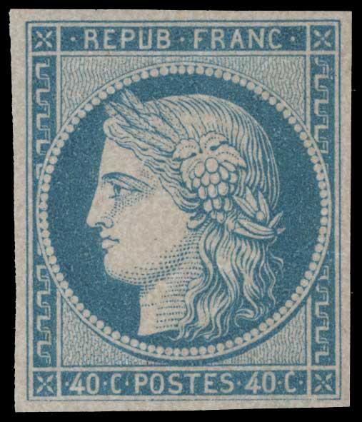 Lot 6126 - France Classic Issues 1849-1875 FRANCE, 1849, 40c BLUE (UNISSUED) UNUSED, #7 var., full margins, without gum as issued, very fine, rare, with 2022 Pascal Scheller cert., listed in footnote in Scott at $28,000.00, Yvert #5B @ €16,000.00. both values for no gum....US$3,500