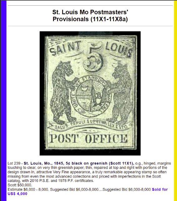 St. Louis Mo Postmasters' Provisionals (11X1-11X8a) - Top 10 prices paid for examples in N.H., O.G., unused, used, multiples, pairs and on cover.