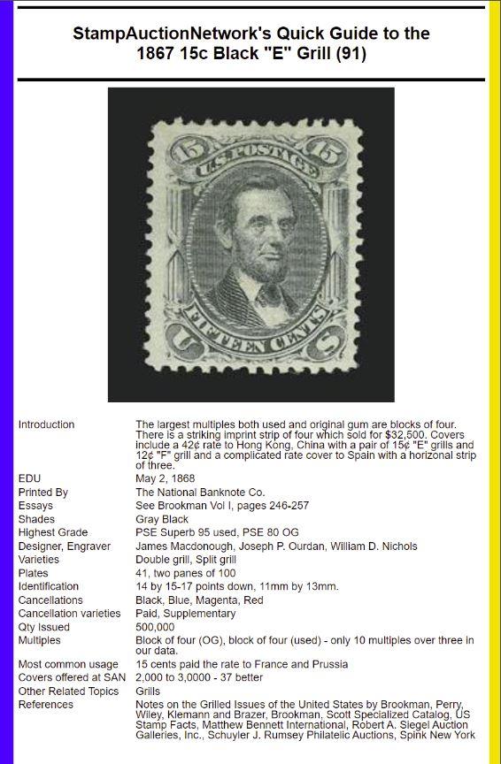 1867 15c Black "E" Grill (91) - Digital Handbook to stamps in never hinged, original gum, used, multiples, pairs and on cover.