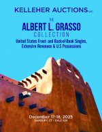 • Daniel F. Kelleher Auctions, LLC The Albert L. Grasso Collection: United States Front- and Back-of-Book Singles, Extensive Revenues & - December 17-18, 2025 A single-owner sale featuring United States Front- and Back-of-Book Singles, Extensive Revenues & U.S. Possessions. Overall, a high degree of completion with outstanding United States featuring front-of-the-book including scarcer issues and the highly sought-after Reprints and Special Printings; a nearly complete set of Postage Dues including the prized First Issue Special Printings, a large number of Officials and Newspapers , as well as the rest of the Back-of-the-Book, extensive Revenues with a high degree of completion and featuring a lovely imperf 3¢ Playing Cards, plus others, and a formidable section of the Red and Green Documentaries as well as a terrific Telegraph collection.