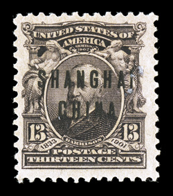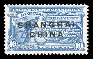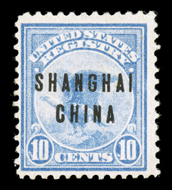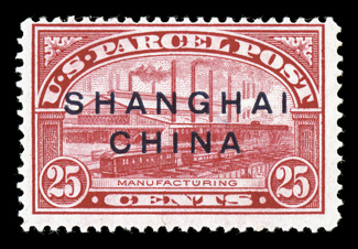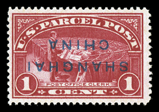 blue overprint, o.g. or large part o.g., a few small faults, fine-v#308, 331-40, E6, F1, Q1-9, Small sans-serif Darrah "Shanghai/China" overprints, classified as pre-cancels by the Post Office, 22 different including 1c Parcel Post with inverted blue overprint, o.g. or large part o.g., a few small faults, fine-very fine; a rare group. (imagea) (imageb) (imagec) (imaged) (imagee) (Image) Est. $2,000-3,000