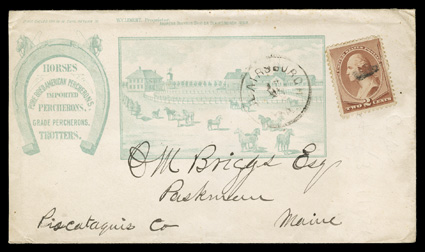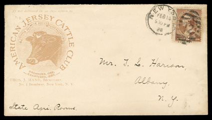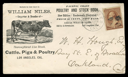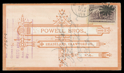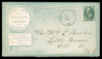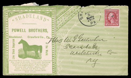 hundreds of covers from and to the Powell Bros., first while in Syracuse, N.The postal history of the Powell Bros. Livestock Emporium exhibit and collection, comprised of an exhibit in two binders and an extensive collection in eleven binders of hundreds of covers from and to the Powell Bros., first while in Syracuse, N.Y. during the Civil War, then from Crawford county, Pa. from the mid-1860's into the 20th century as the town changed its name from Spring Corners to Spring to Springboro and finally to Shadeland, the covers are not only from the Powell Bros. with their various all-over advertisements and illustrated corner cards, but a great many are to the firm and bear illustrated corner cards depicting horses and other livestock as well as other subjects, these covers come from a wide range of places and some have county or other better postmarks and cancels such a "Jack-O-Lantern", the collection is mounted and written-up on pages and loose, with a good amount of ancillary information, illustrations and historical information, typical mixed condition, many fine-very fine; includes the owner's 2007 44 page publication on the subject. (imagea) (imageb) (imagec) (imaged) (imagee) (imagef) (Image) Est. $4,000-5,000